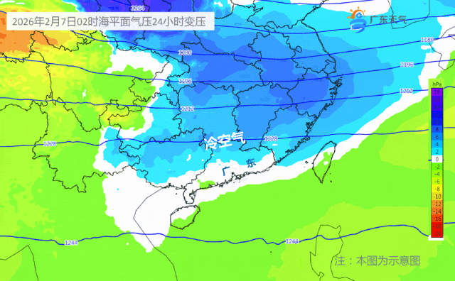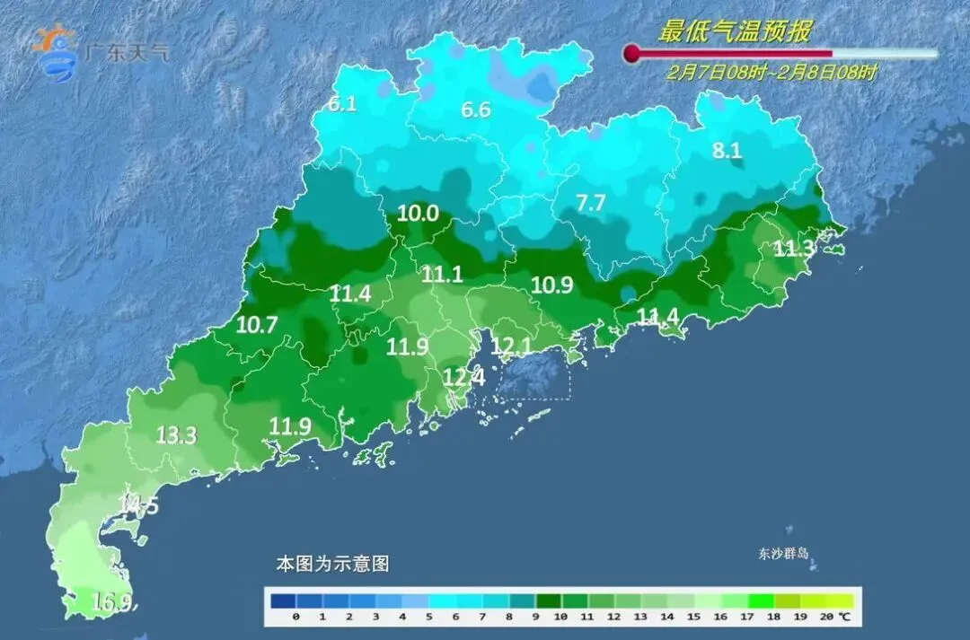 广东省气象台预计,2月7日冷空气继续南下影响广东,部分市县伴有小雨,气温继续下降,过程最低气温出现在2月8日或9日早晨,粤北部分市县有5℃以下低温,高海拔山区1~3℃,局部有霜(冰)冻,2月10日起气温逐渐回升。