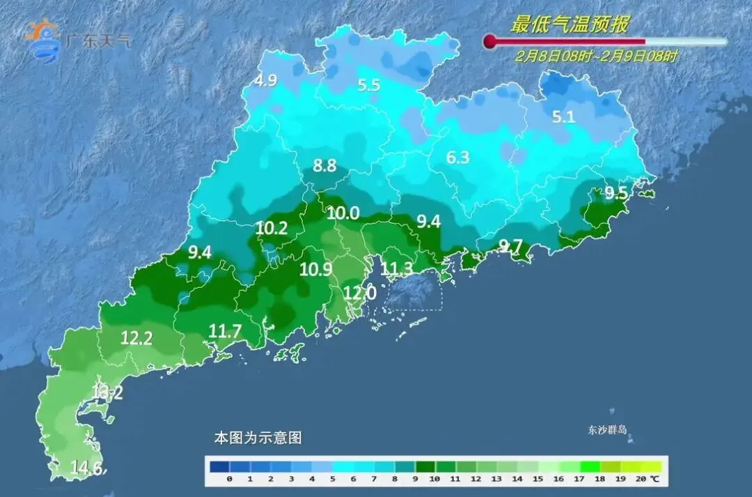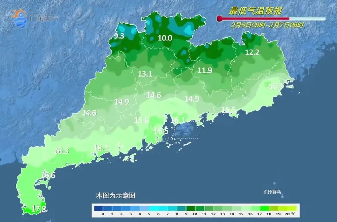 2月9日,粤北市县多云转小雨,其余市县多云,局部有小雨。最低气温:粤北和珠三角北部市县3~7℃(高海拔山区1~3℃),雷州半岛市县15~18℃,粤东市县7~9℃,其余市县9~12℃。