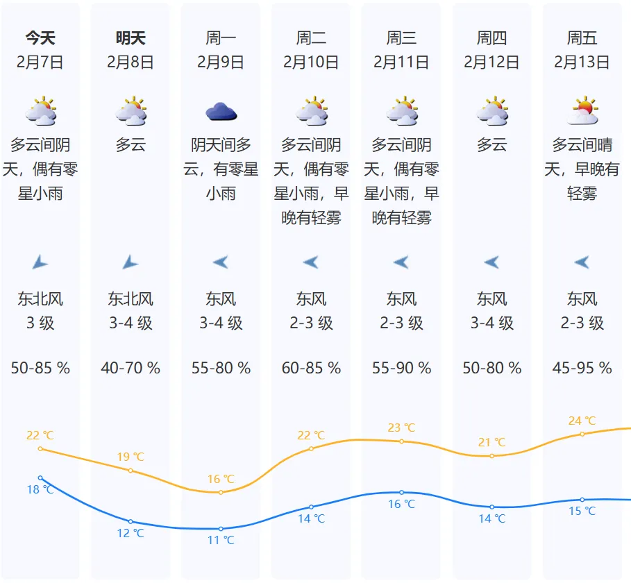 2月7日,粤北市县分散小雨转多云间阴天,其余市县多云间阴天,局部有小雨。粤西市县和海面早晨有(轻)雾。气温继续下降,最低气温:粤北市县7~12℃(高海拔山区3~5℃),南部沿海市县16~20℃,其余市县13~15℃。
