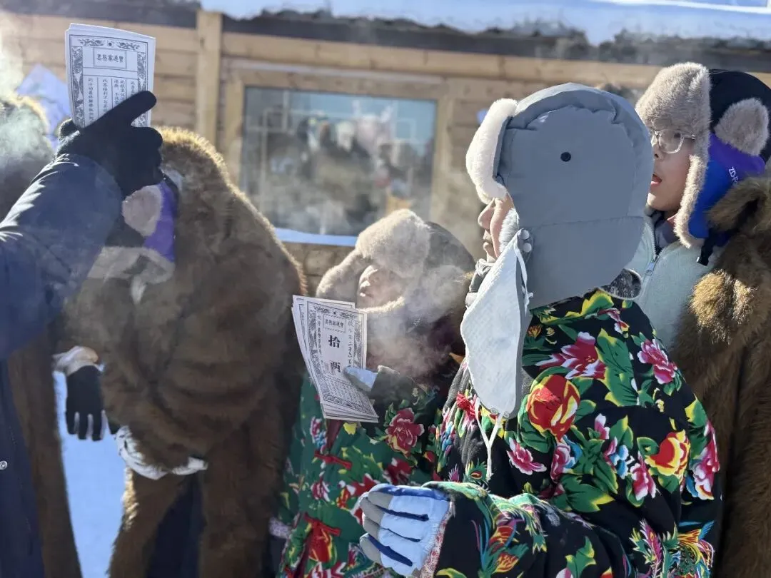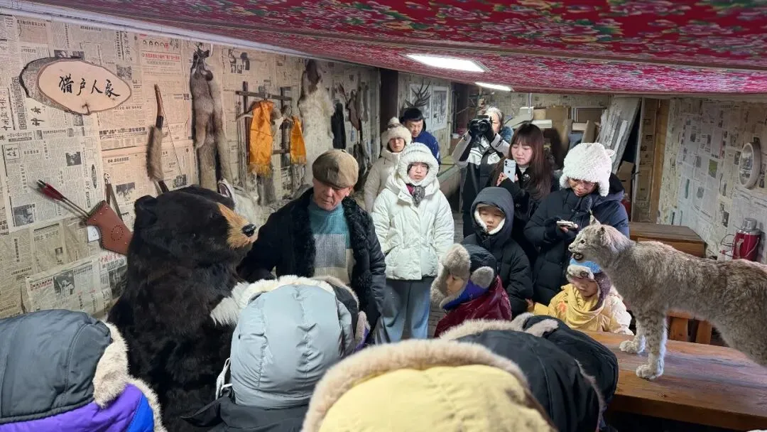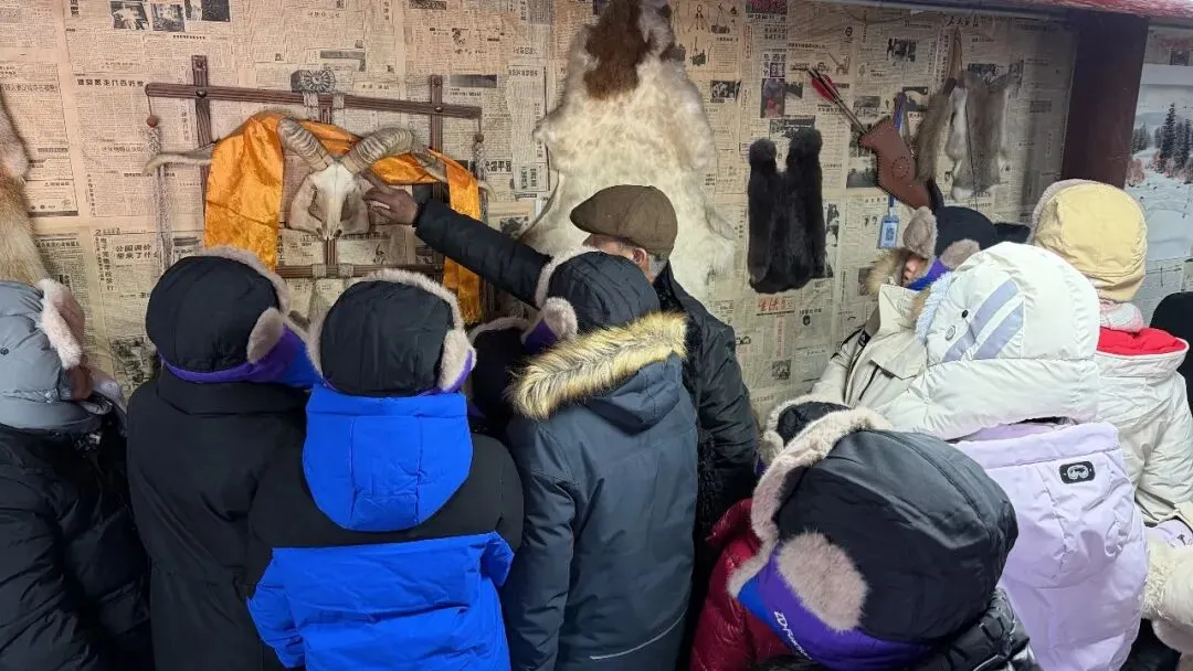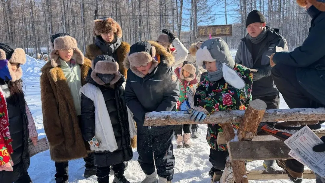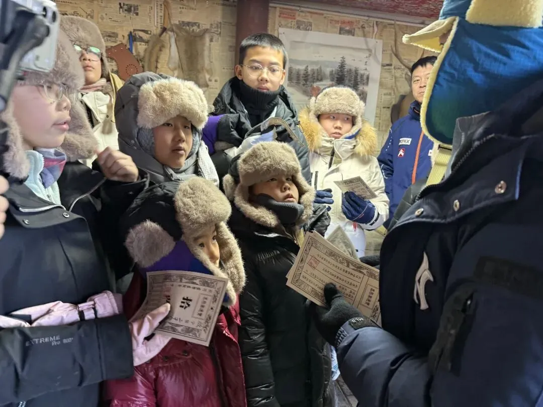 车辆停稳,原木房屋、积雪红灯笼映入眼帘,猎户“大当家”身着传统服饰等候。一场林区情景剧快速点燃氛围,猎人巡山、动物觅食的情节让孩子们身临其境。随后“大当家”详解规则:体验活动、问答闯关可赚“银票”,攒够5张就能兑换热奶茶、暖心饮,孩子们即刻摩拳擦掌。换上色彩艳丽的东北大花袄与雪地棉鞋,南方萌娃变身“林区小住户”。关老师带来科普课堂,详解黑熊、猞猁等本土动物习性,传授野外避险技巧:遇动物别对视、不奔跑,缓慢倒退离开,密封食物不激怒动物。孩子们踊跃问答,收获知识与“银票”双丰收。