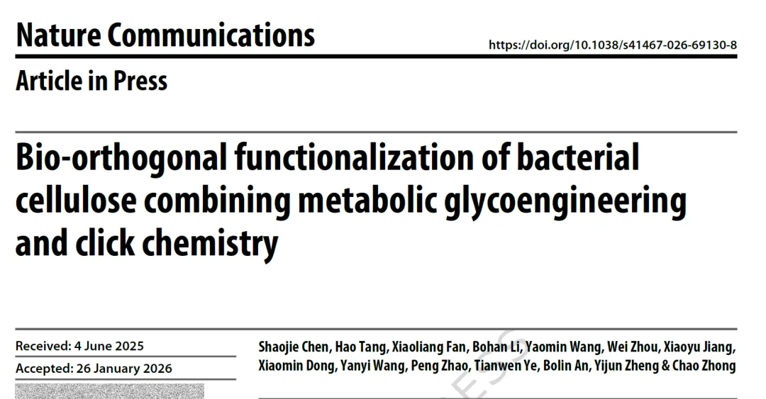 为克服这些局限,本研究提出将代谢糖工程与点击化学相结合的策略。点击化学(特别是叠氮-炔环加成反应)具有反应条件温和、效率高、生物正交性好等优点。通过代谢途径将“点击化学手柄”(如叠氮基团)引入BC,再利用点击反应接枝各类功能分子,有望在保持BC本体性能的同时,实现其功能的高度定制化与多样化集成。