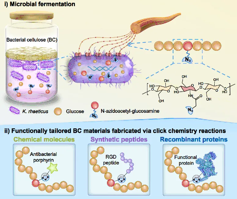 细菌纤维素(BC)由醋酸杆菌科微生物合成,具有高纯度、优异的机械性能、良好的生物相容性及三维纳米纤维网络结构,在组织工程、柔性电子和生物材料等领域展现出巨大潜力。然而,天然BC缺乏诸如抗菌、抗炎、抗氧化或细胞黏附等生物活性,限制了其在高端生物医学应用(如智能伤口敷料、组织再生支架)中的直接使用。