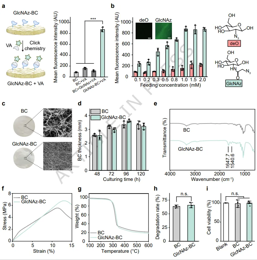 优化实验表明,1 mM GlcNAz为最佳喂养浓度,能在不影响BC产量和厚度的前提下实现叠氮基团的有效掺入。扫描电镜(SEM)显示GlcNAz-BC孔径略小,可能源于叠氮基团增强的分子间作用力。傅里叶变换红外光谱(FTIR)在1540.6 cm⁻¹和1647.7 cm⁻¹处出现酰胺特征峰,证实了GlcNAz的掺入。力学测试表明GlcNAz-BC的杨氏模量与天然BC相当,但疲劳应变提高了120%。热重分析、生物降解实验和细胞相容性测试均表明,功能化未损害BC的热稳定性、可降解性和生物相容性。该策略在K. xylinus和K. sucrofermentans等其他菌株中也同样有效,展示了其菌株普适性。