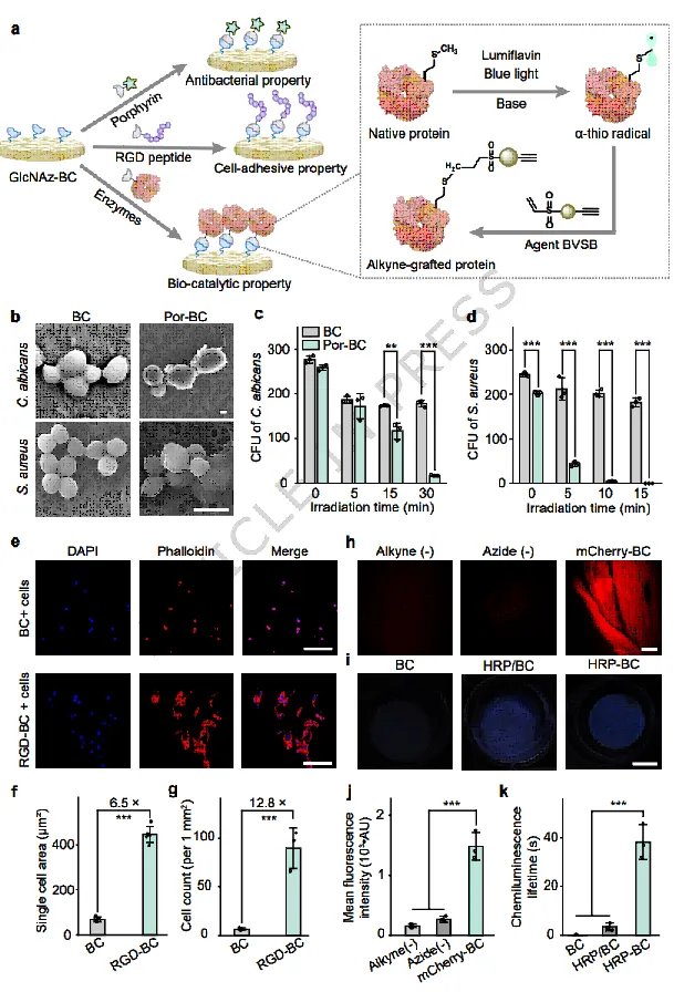 小分子功能化(抗菌):通过CuAAC将炔基修饰的光敏抗菌卟啉(Zn-Epor-PS)接枝到BC上,得到Por-BC。在白光照射下,Por-BC对白色念珠菌和金黄色葡萄球菌表现出强效杀灭作用(30分钟内减少>90%,10分钟内对S. aureus减少>99%)。