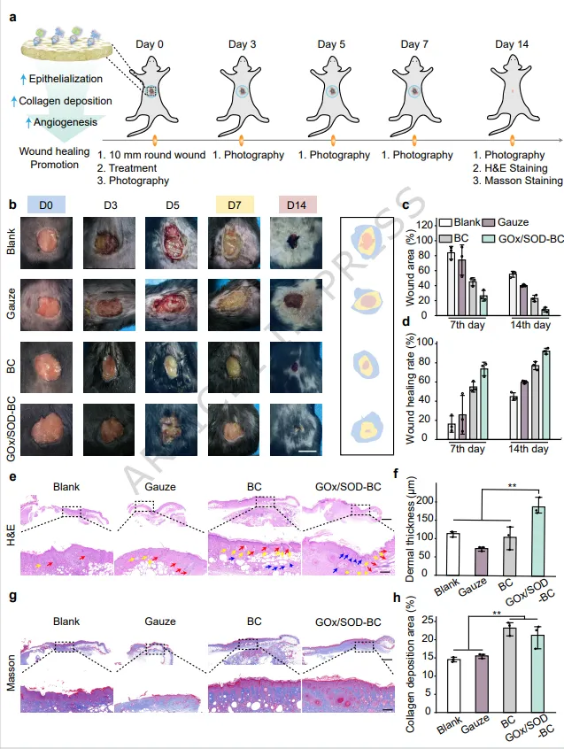 体内疗效评估:在db/db糖尿病小鼠全层皮肤缺损模型中,GOx/SOD-BC敷料展现出最佳的治疗效果。至第14天,伤口闭合率达到92.12%,显著优于纯BC组(77.05%)、纱布组(59.93%)和未处理组(44.78%)。组织学分析(H&E和Masson染色)显示,GOx/SOD-BC组伤口上皮化更完整、真皮层更厚、胶原纤维排列更有序、新生血管更丰富。免疫荧光分析表明,该敷料能下调促炎因子(TNF-α, IL-6),上调抗炎因子IL-4,有效调节伤口微环境。21天皮下植入实验证实了其良好的体内生物安全性。