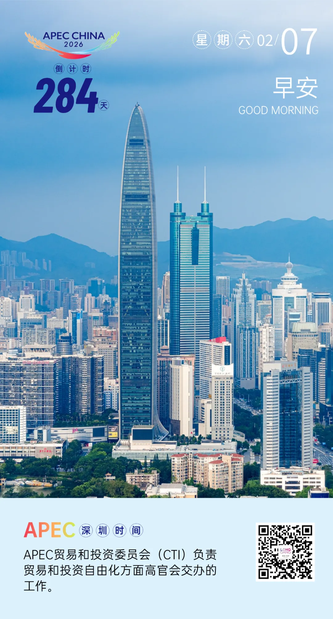 2026年亚太经合组织(APEC)领导人非正式会议,将于11月18日至19日在深圳举行,各方亚太伙伴将相约深圳,谱写更加精彩的亚太合作新篇章。龙岗融媒特别推出《APEC深圳时间》专栏,通过一张张精美倒计时海报,与你一同见证APEC盛会的到来!