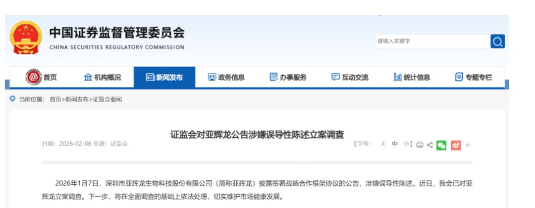 2026年2月6日,深圳市亚辉龙生物科技股份有限公司(股票代码:688575,以下简称“亚辉龙”)发布公告称,公司于当日收到中国证券监督管理委员会(以下简称“证监会”)下发的《立案告知书》。因公司涉嫌在信息披露中存在误导性陈述,根据《中华人民共和国证券法》等相关法律法规,证监会决定对公司立案调查。