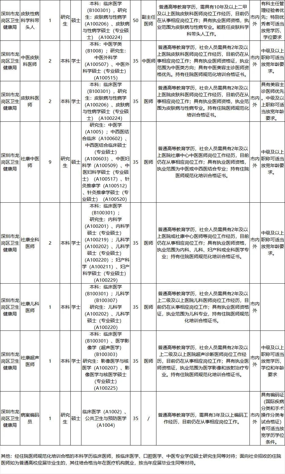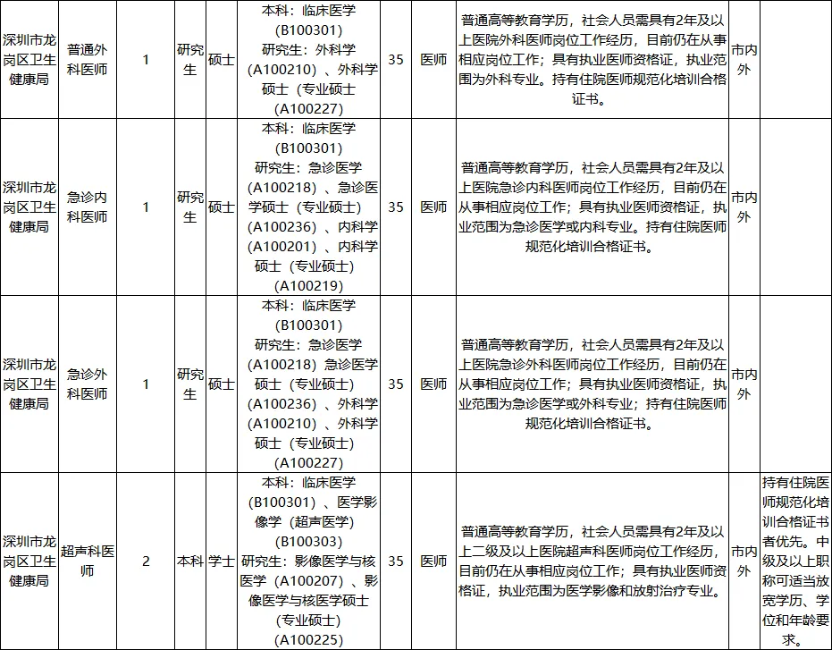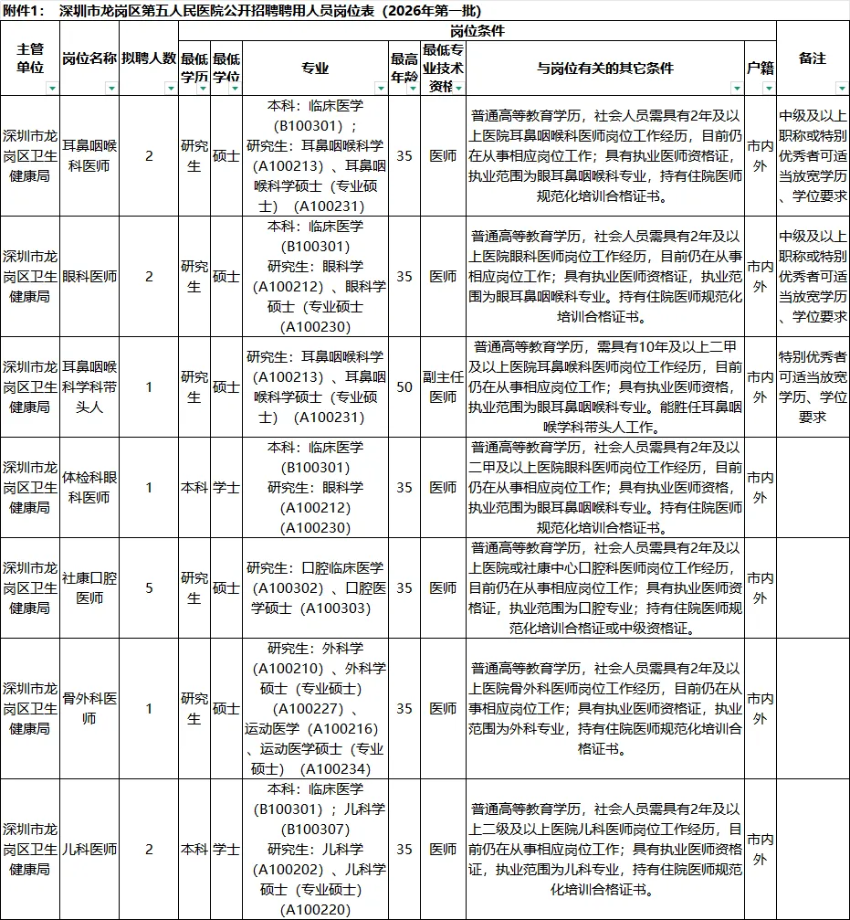 具体招聘岗位、人数和岗位条件详见附件《深圳市龙岗区第五人民医院2026年公开招聘岗位汇总表》。