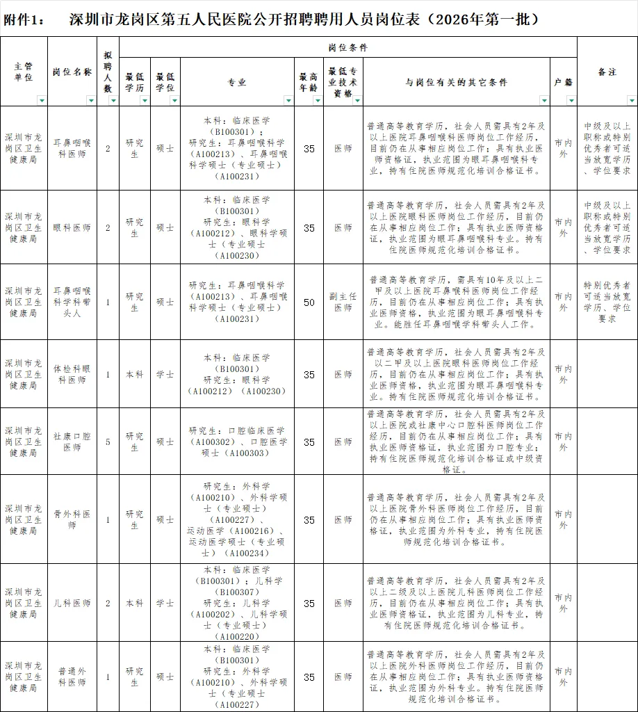 具体招聘岗位、人数和岗位条件详见附件《深圳市龙岗区第五人民医院2026年公开招聘岗位汇总表》。
