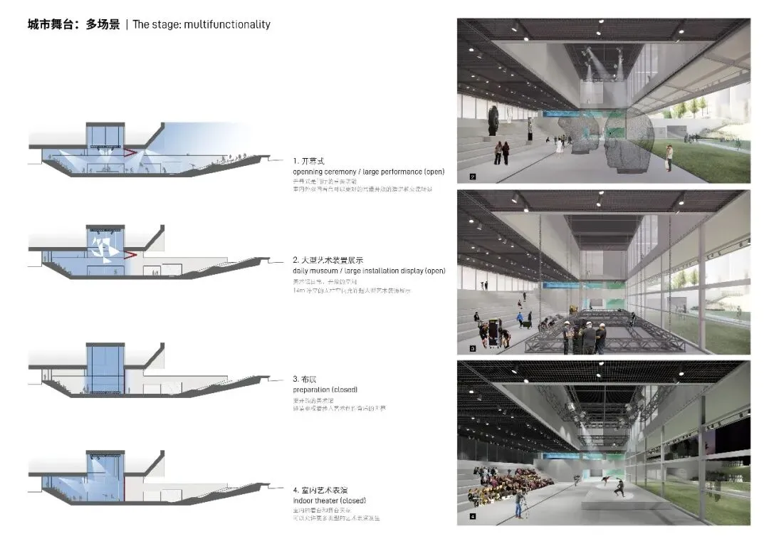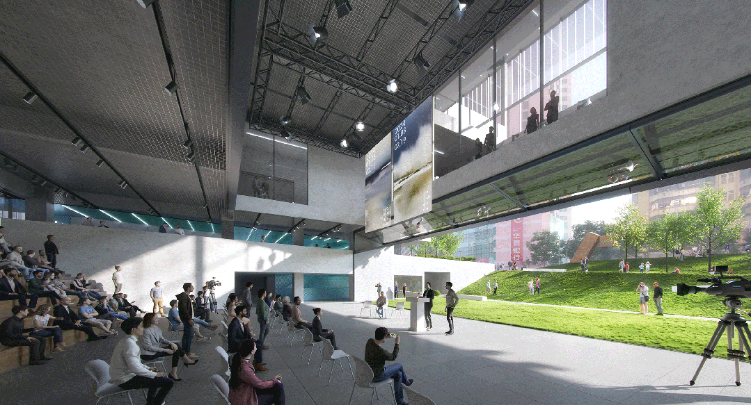 镜面亦是大屏幕,可以完全打开的建筑立面,室内台地和室外绿坡形成的双面舞台,可激发多种有想象力的使用场景,草坪音乐节、露天电影院、实验性新媒体艺术都可以在此发生。