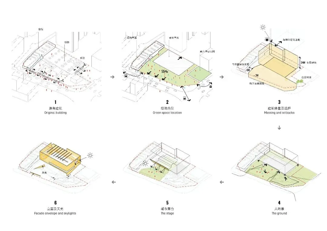 和大多数屹立于空旷场地中的美术馆不同,罗湖美术馆周边高层环绕,扩建五倍建筑规模的同时保持55%绿地率是一个艰巨的挑战。我们的策略是变挑战为机遇,塑造一个充分融入公园中的美术馆;与社区近距离的交融,使得美术馆更方便的实现公共教育使命,服务片区与城市的混合业态将为美术馆更可持续的运营提供支撑。