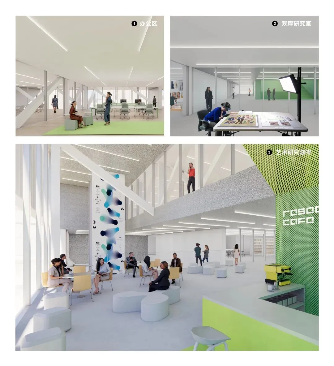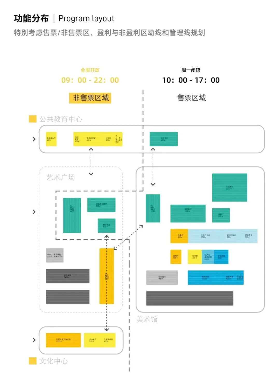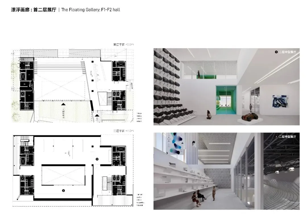 在动线设计方面,多样的动线设计允许不同长度的参观路径。我们特别关注美术馆运营时间范围内外的不同动线场景,允许文化设施和公共教育中心拥有不同的运营时间,甚至7天24小时开放。此外,资深的艺术爱好者还可前往漂浮画廊三层研究室观摩研讨,并可以在相邻的沙龙咖啡厅和艺术研究者互动交流。美术馆办公区设置在四层临近研究区域,工作人员可以从漂浮画廊北侧的独立入口和专属电梯到达。