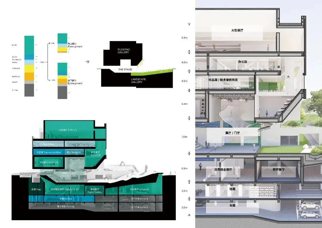 考虑到场地的内涝风险,我们将最重要的展览空间和珍品库房置于漂浮画廊中。便捷的货运流线,将卸货区与地上地下的各个馆藏和备展间连接起来。