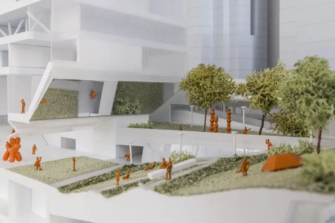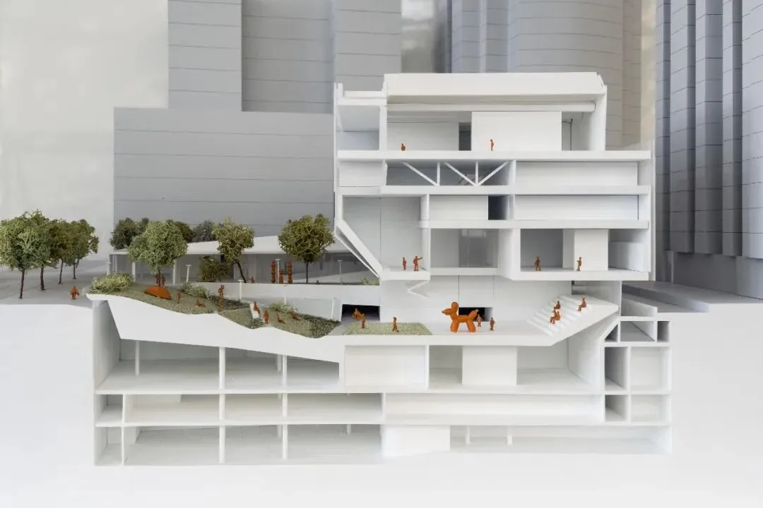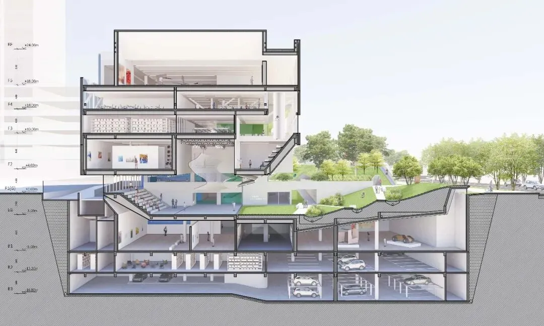 阅读平台与图书馆联通,通透的界面,室内外充分渗透;艺术草坪是城市舞台的重要组成,舒缓的草坡既是观看演出的看台,又是周末休闲野餐或瑜伽的圣地;活力山丘为社区活动和前来美术馆的亲子家庭设计;共享广场则与周边地块共享共建,可以举办艺术市集,布置临时艺术装置。