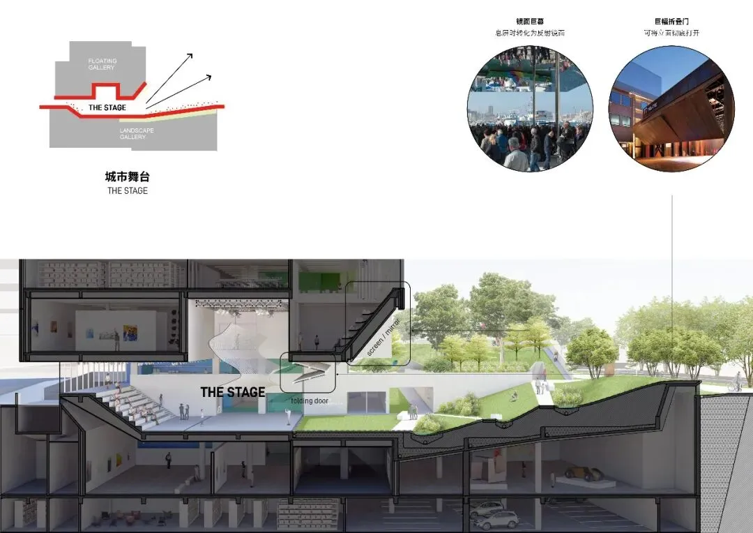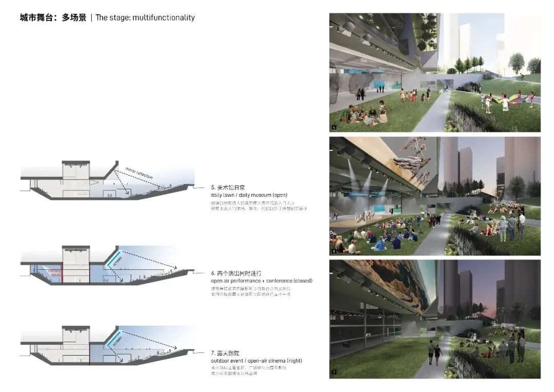 在剖面上,美术馆分为漂浮画廊与地景画廊两个部分,中间嵌入城市舞台,舒缓的绿坡将人们自然带入美术馆的入口大厅。入口上方倾斜的镜面巨幕面向艺术草坪,每个人都可以看到自己,让日常的生活场景转化为艺术本身。
