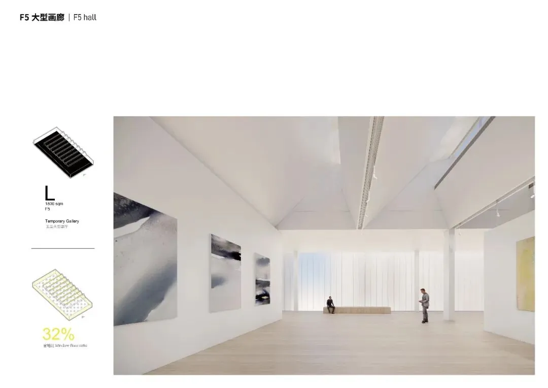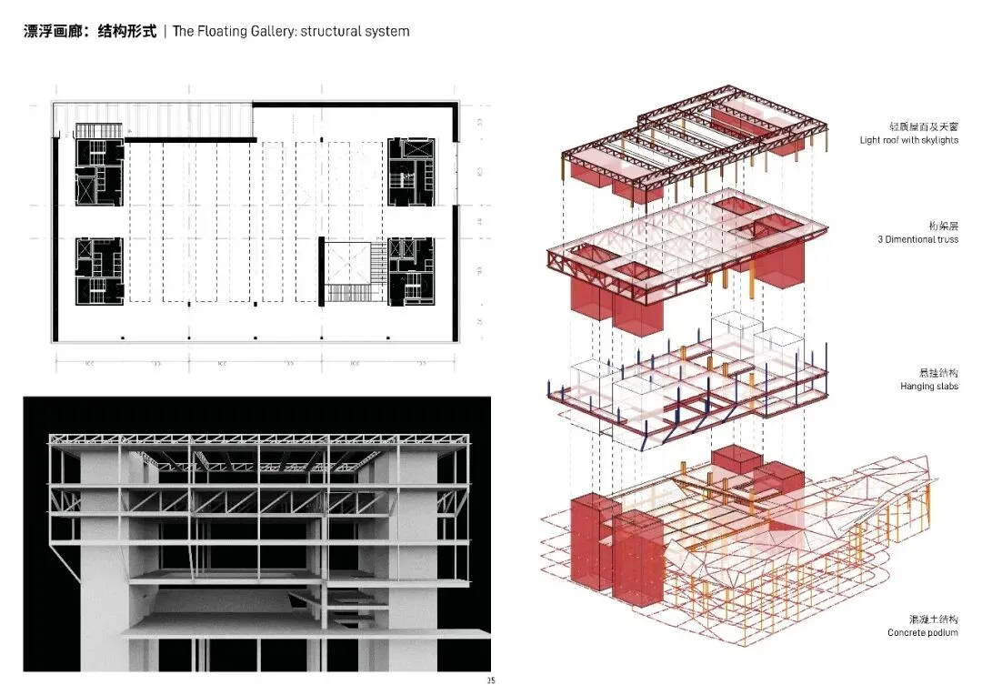 漂浮画廊由南北两个核心筒通过空间桁架托起,展览空间平面由顶层10*20轴网和其他层10*10构成,不同楼层间视线通透,彼此交互。立面的U型玻璃立面形成薄纱般表皮塑造柔和的基础光环境,顶层的大型画廊具有2000平米的单层面积,模块化的空间方便划分成不同的艺术展览空间,顶部的天窗剖面设计利用漫反射引入间接光,可变滤光帘幕为不同艺术形式进一步提供精准适宜的光环境。