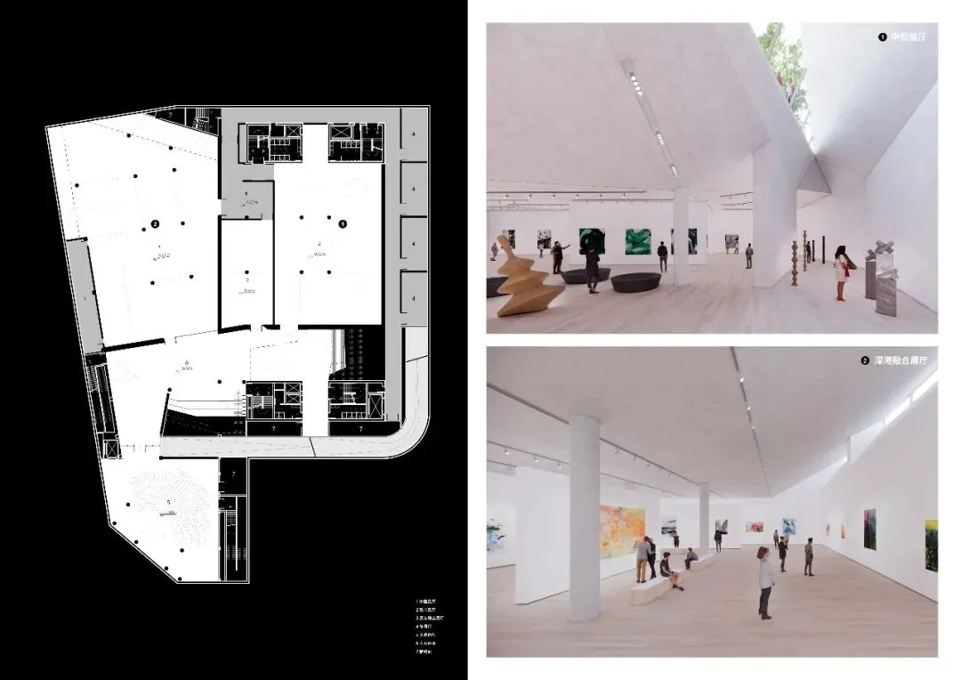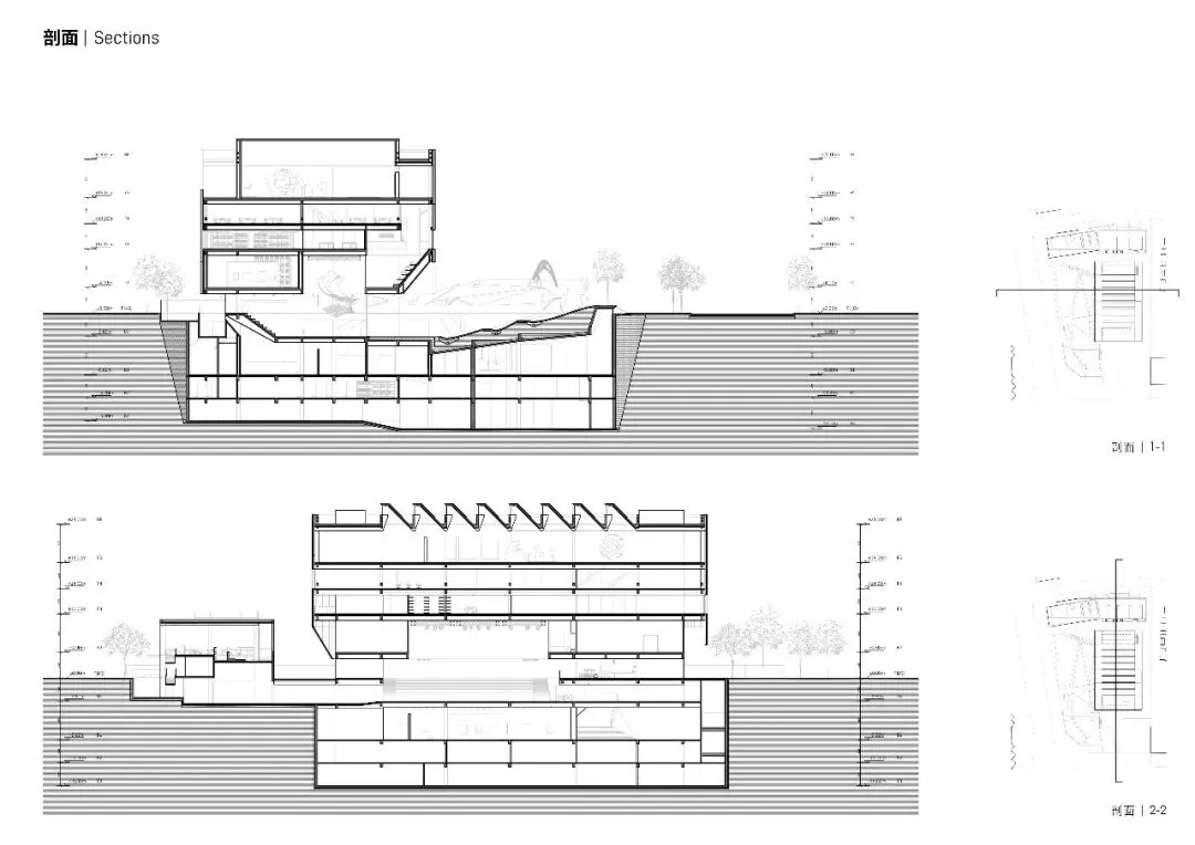 地景画廊通过对3米覆土空间的起伏和刻画,提供三个净高不同的展厅,并在三处适宜的位置以天窗引入自然光,满足更多的展陈需求。三个展厅通过开放展示区与南侧文化设施中的多功能厅和与书吧结合设计的美术馆商店相连。整个地景画廊多变动态的空间体验,与通透简洁的漂浮画廊形成鲜明反差。