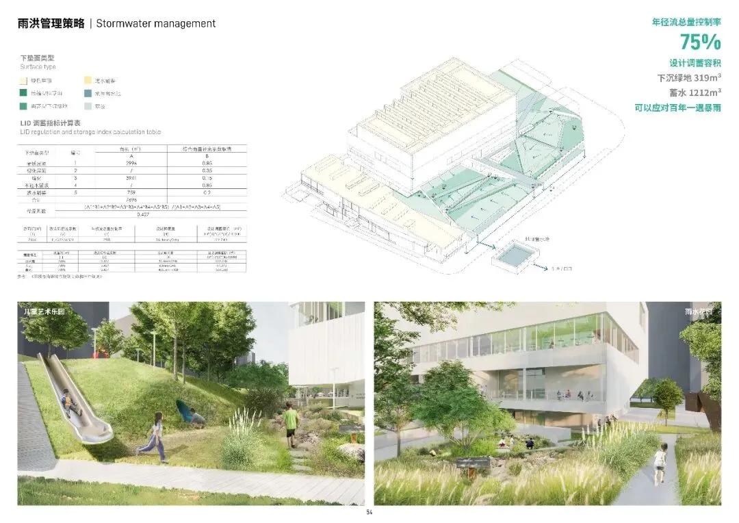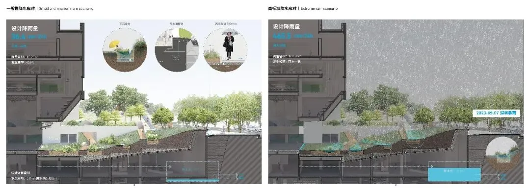 改造后的美术馆通过建筑与景观一体化的整合设计,重建与水更友好的连接:多级生态与海绵措施,蓄滞净用相互结合,巧妙利用各类空间发展出蓝绿结合的雨水适应性景观,确保所有建筑空间的水安全。地下工程中还预留足够的额外蓄涝设施,以应对类似2023.08.26高标准暴雨事件带来的风险。作为新的城市公共空间,给大众带来水与自然的过程体验,让艺术与生态构成日常生活的新图景。