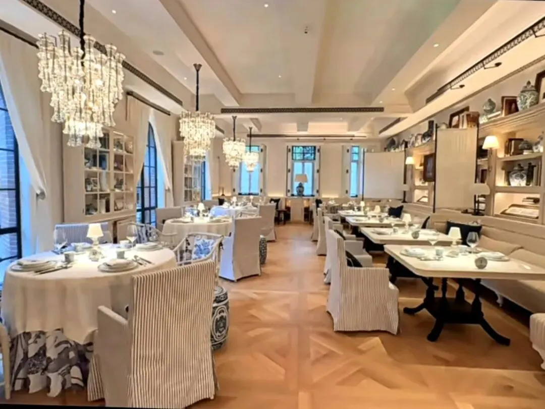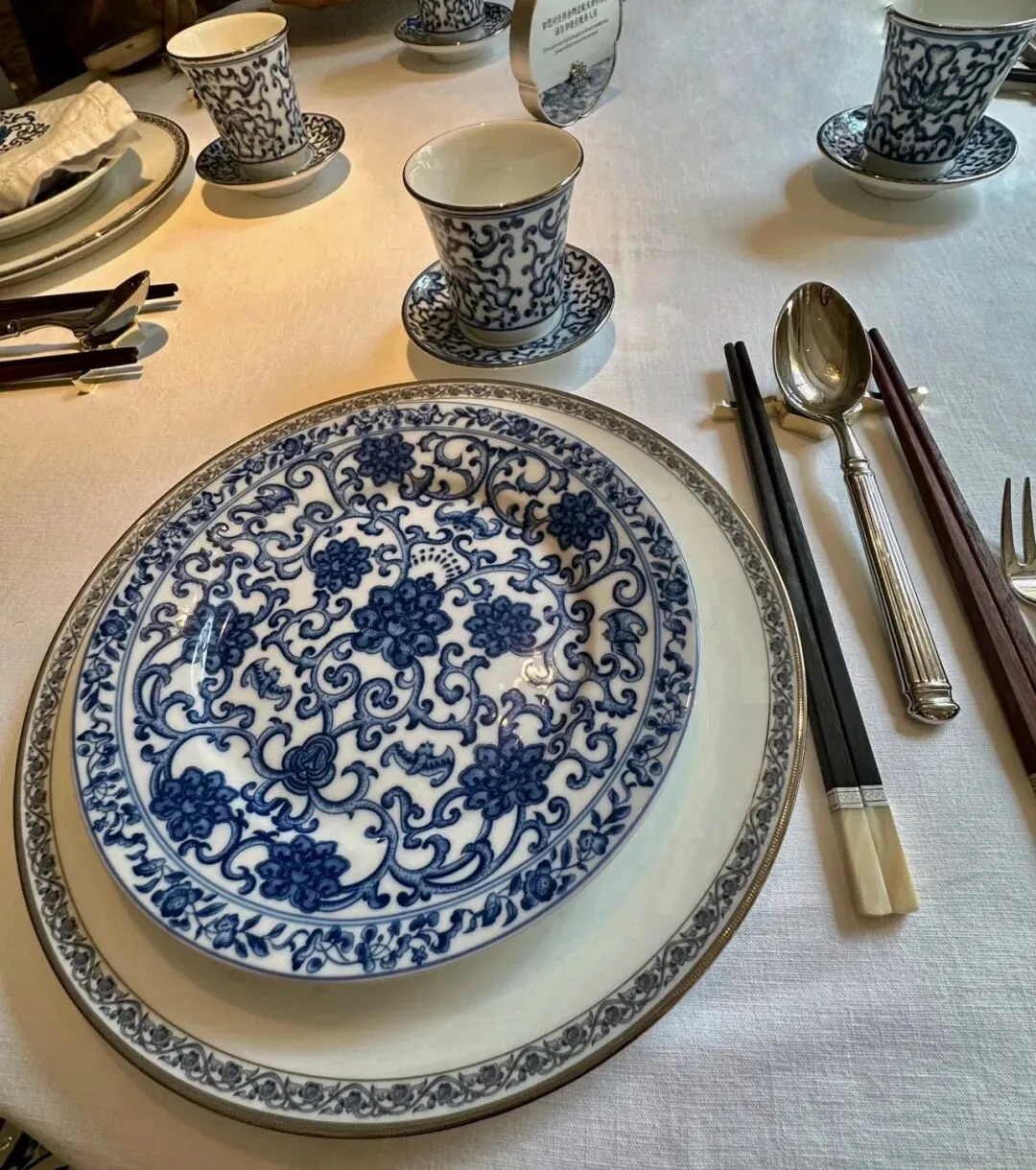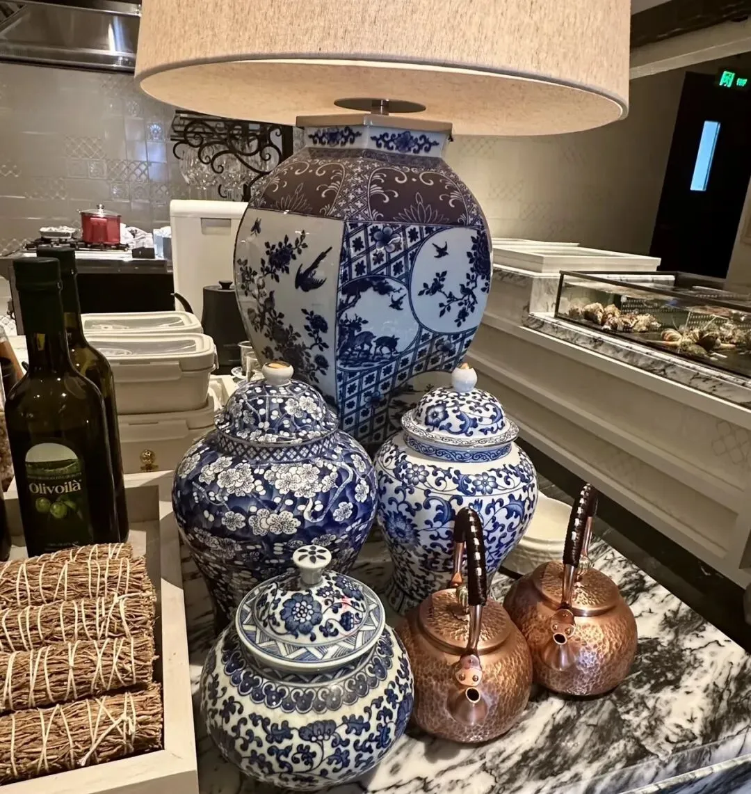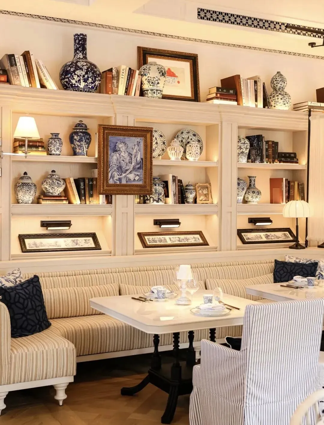 以中国代表性瓷艺——青花瓷为主线,放眼望去,陈设、餐具,都充满了“青花瓷”元素。法式风情与青花瓷、中西美学、历史与生活方式在此碰撞。