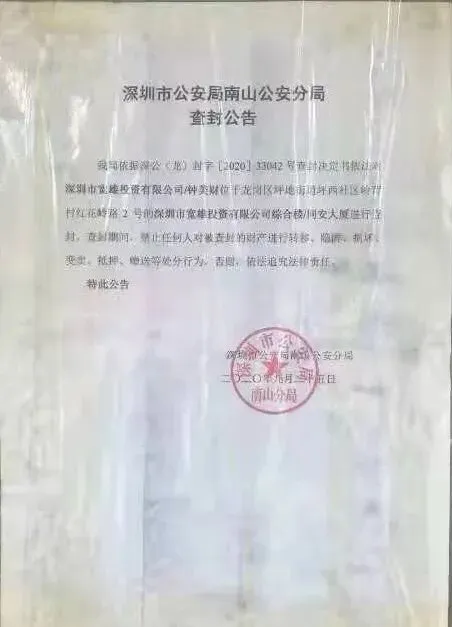 2020年9月,南山公安分局已对同安大厦张贴《查封公告》,明令:“未经许可,不得转让、出租、抵押或以其他方式处分。”