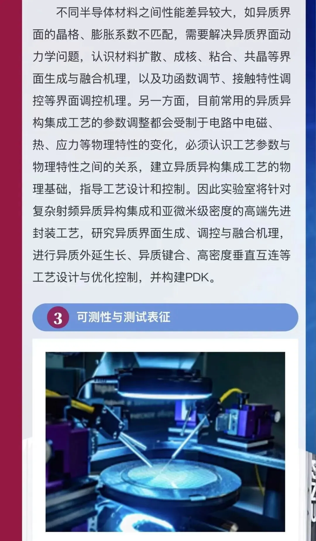射频异质异构集成全国重点实验室(以下简称实验室)于2022年经国家有关部委批准立项。本实验室由深圳大学牵头建设,上海交通大学和中兴通讯股份有限公司参与共建。实验室围绕射频异质异构集成领域的关键科学技术问题,1)跨尺度载流子-电磁-热-应力多物理特性耦合与演变规律、2)多性能多功能协同机制与可测性原理、3)异质界面生成与工艺量化调控机理等,开展系统深入的原创性、前瞻性基础研究和核心技术攻关,认识基本原理,掌握理论方法与核心技术,形成射频异质异构集成能力、平台和标准,研制一系列面向国家重大需求的射频异质异构集成电路系统。实验室研究将推动集成电路变道超车发展和信息系统集成技术快速进步,实现从集成电路到集成系统的变革和跨越,为我国集成电路产业尤其是射频异质异构集成产业的跨越式发展做出重大贡献。目前,实验室的主要研究方向包括:1)耦合多物理场理论与设计方法学;2)射频异质异构集成工艺;3)可测性与测试表征;4)射频异质异构集成技术应用等。
