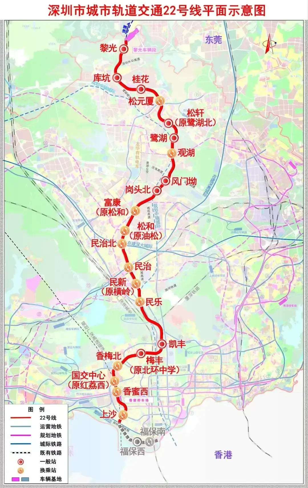 作为服务福田、龙华的中部走廊轨道快速骨干线路,22号线一期起于福田上沙站,止于龙华黎光站,全长34.7公里,设21座地下站,串联香蜜湖、深圳北站中心商务区等重点片区,途经龙华6大重点片区,包括龙华中轴数字产业核心区、鹭湖中心城等,承担福田中心区对龙华、观澜的辐射带动作用。