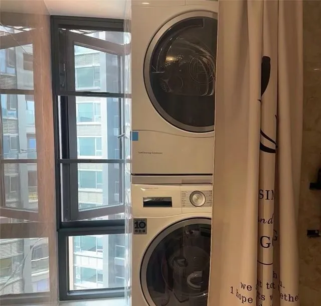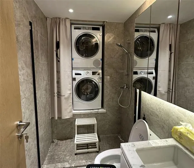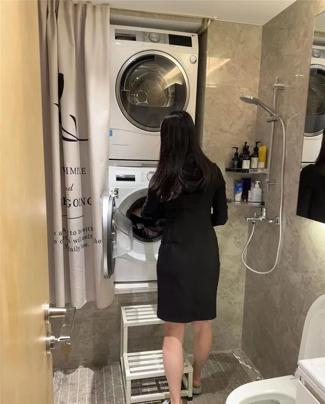从使用逻辑上看,这招确实解决了小户型最头疼的问题,洗衣机没地方放。阳台要晾衣服,厨房放不下,客厅更不可能,卫生间是唯一的选择。而把洗烘机叠起来,垂直利用空间,比横着摆省了至少一半的占地面积。