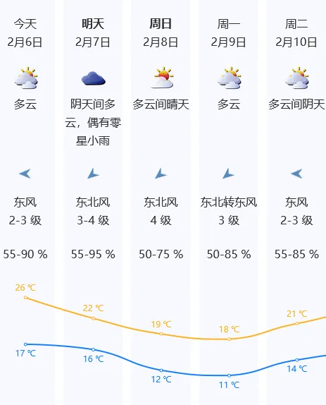 2月7日-2月9日,受新一股冷空气影响,气温逐日下降,北风清劲,其中7日偶有零星小雨,8日-9日早晚体感较冷,最低气温11℃左右。