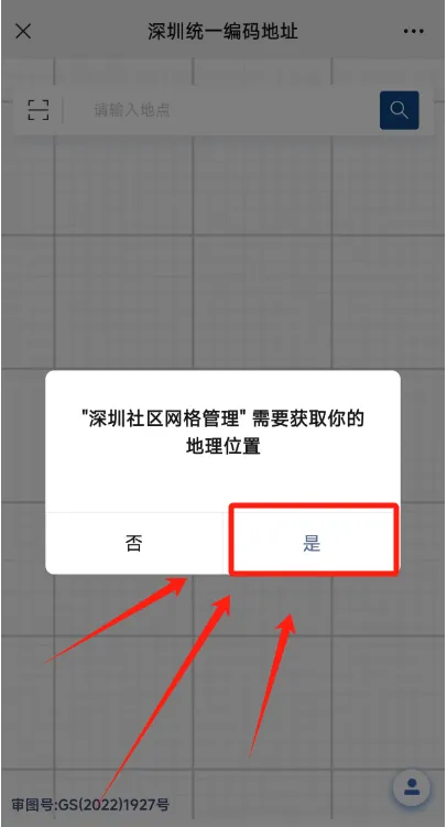 2、进入系统后,有弹窗提示"深圳社区网格管理”需要获取你的地理位置,点击“是”,系统将直接定位到你所处的位置。