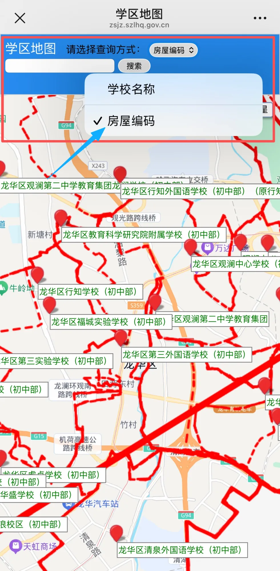 ②将查询方式切换为【房屋编码】后,输入查询到的房屋编码,再点击搜索,就可以知道自己的房屋能申请什么学校了。