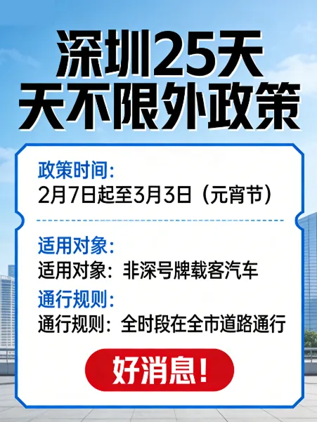 好消息!深圳从 2 月 7 日起至 3 月 3 日(元宵节),正式开启 25 天不限外政策,非深号牌载客汽车可全时段在全市道路通行。