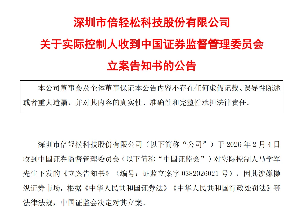 倍轻松(688793.SH)实际控制人马学军再遭立案调查。2026年2月6日公告显示,公司于2月4日收到证监会对马学军先生下发的《立案告知书》,因涉嫌操纵证券市场,证监会决定对其立案。
