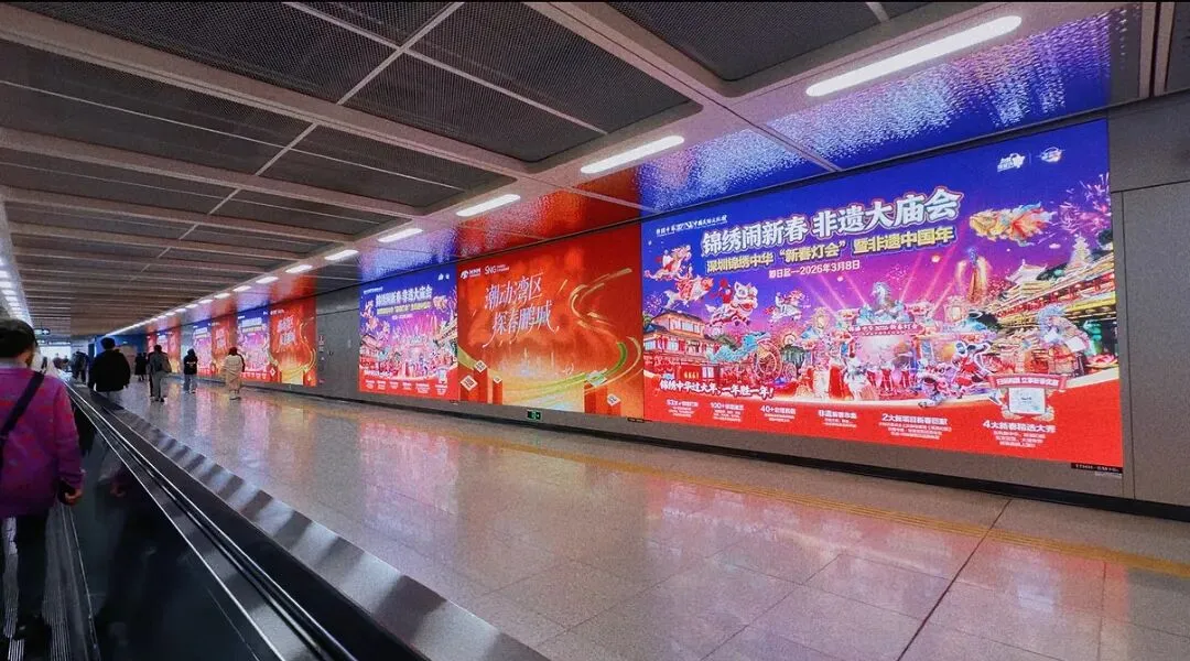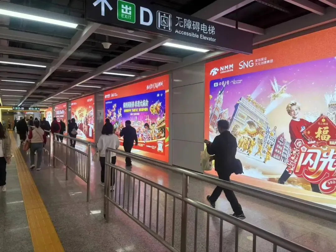 深圳湾公园站品牌通道D化身“潮动湾区·景点推荐”指南墙,通道沿路的广告灯箱串联起直观清晰的景点矩阵。锦绣中华、世界之窗、欢乐港湾、小梅沙等深圳本地文旅地标与丹霞山、古龙峡等周边旅游热门目的地尽数呈现,更有深圳美术馆、光明艺术中心、滨海艺术中心等文艺好去处,为市民春节出行提供一站式参考。