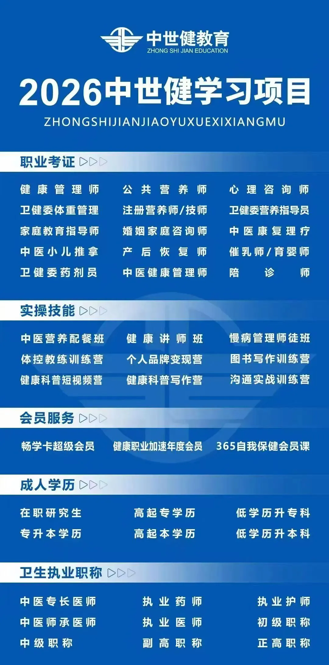 中世健教育成立于2011年,是全国性健康类职业教育平台。目前学员遍布30多个省份直辖市,每年仅营养师、健康管理师、心理咨询师等考证学员超过10000人,培养了注册营养师等大量优秀学员,教学质量在行业内位居领先水平!中世健特别提醒,卫健委体重管理、注册营养师、公共营养师、健康管理师、心理咨询师报考火热进行中,未来可期!还有中医营养配餐、健康讲师、慢病管理师带徒研修班等技能班火热开展中!请抓住机会,多一项技能,多一片“钱”景!