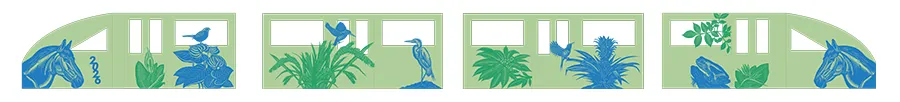 车身外部以坪山的绿色生态为基底,描绘了翠鸟、燕尾太阳鸟、白鹭等生灵,以及树蛙与亚热带植物,将燕子湖片区的生态肌理浓缩于移动空间,展现了人与自然的和谐。这与即将开放的深圳自然博物馆“自然·深圳”展厅形成了巧妙的呼应。车厢内部则以马年传统元素为核心,结合粤式节日氛围,通过可触摸的装饰与光影设计,让乘客在通勤途中感受节日的仪式感,实现了艺术从美术馆空间向公共生活的自然延伸。