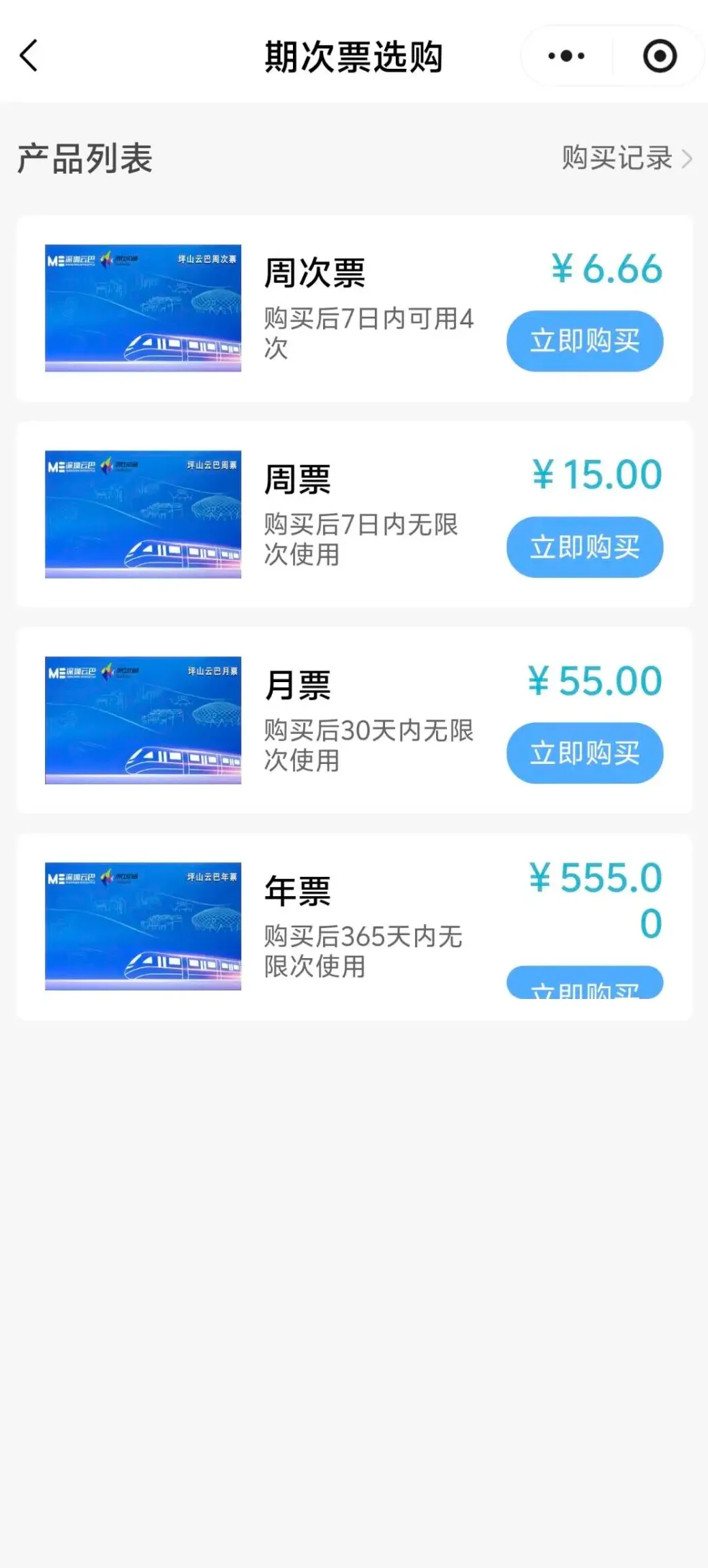 打开“深圳通+”微信小程序:进入【首页】→【乘车票】→ 页面上方点击“日票·次票”选项。根据出行计划与频次,选择对应的票卡种类与有效期。