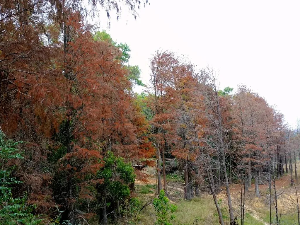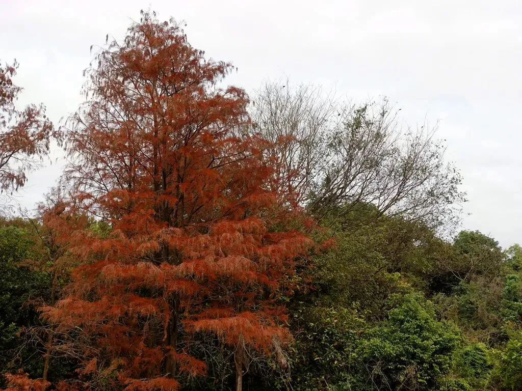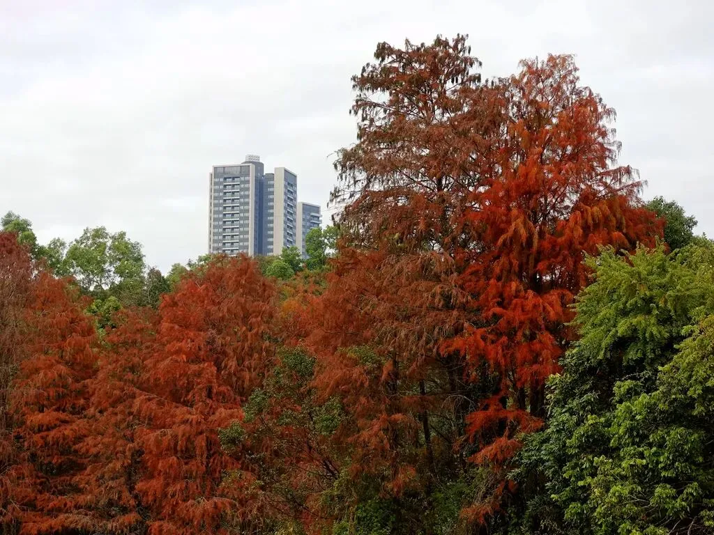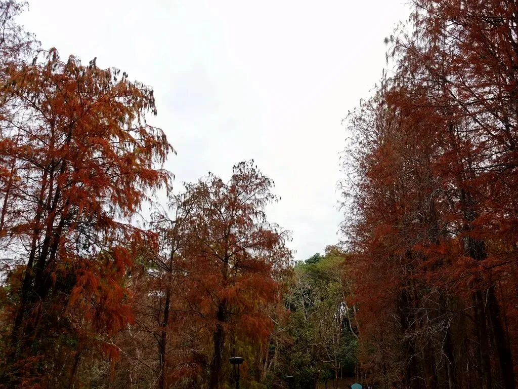 虽然此前在网上有看到大山陂公园的落羽杉,但没想过特意前往观赏。周末去马峦山徒步,看轨迹的时候,发现公园就在徒步起点锦龙站附近。在攀登封神山途中往下俯瞰,能看到湖边成片的火红落羽杉,很想去看看。不过徒步路线是从小梅沙下山,所以当时心里是很惋惜的,跟这么漂亮的风景失之交臂。