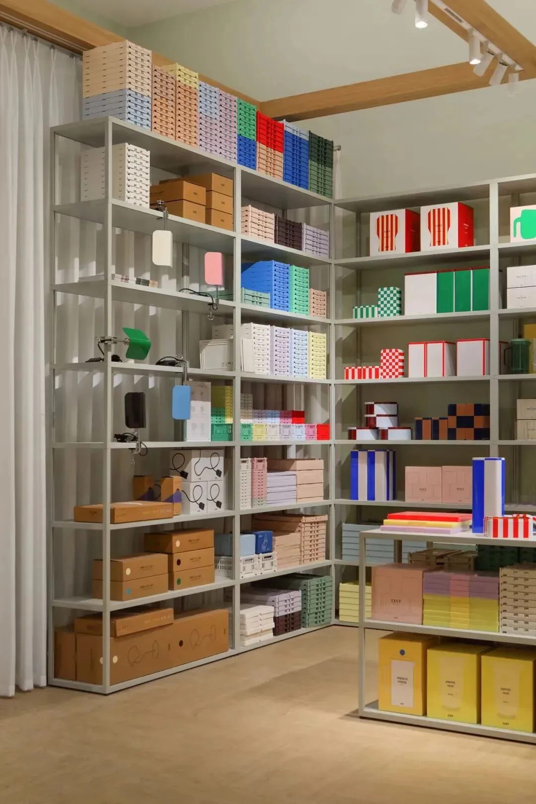 室内陈列以清楚的结构分区展开。从家具到家居配件,各自独立又彼此连贯。高低错落的展示架与堆叠式陈列,使配饰系列呈现出基于重复单元的“日常系统”。