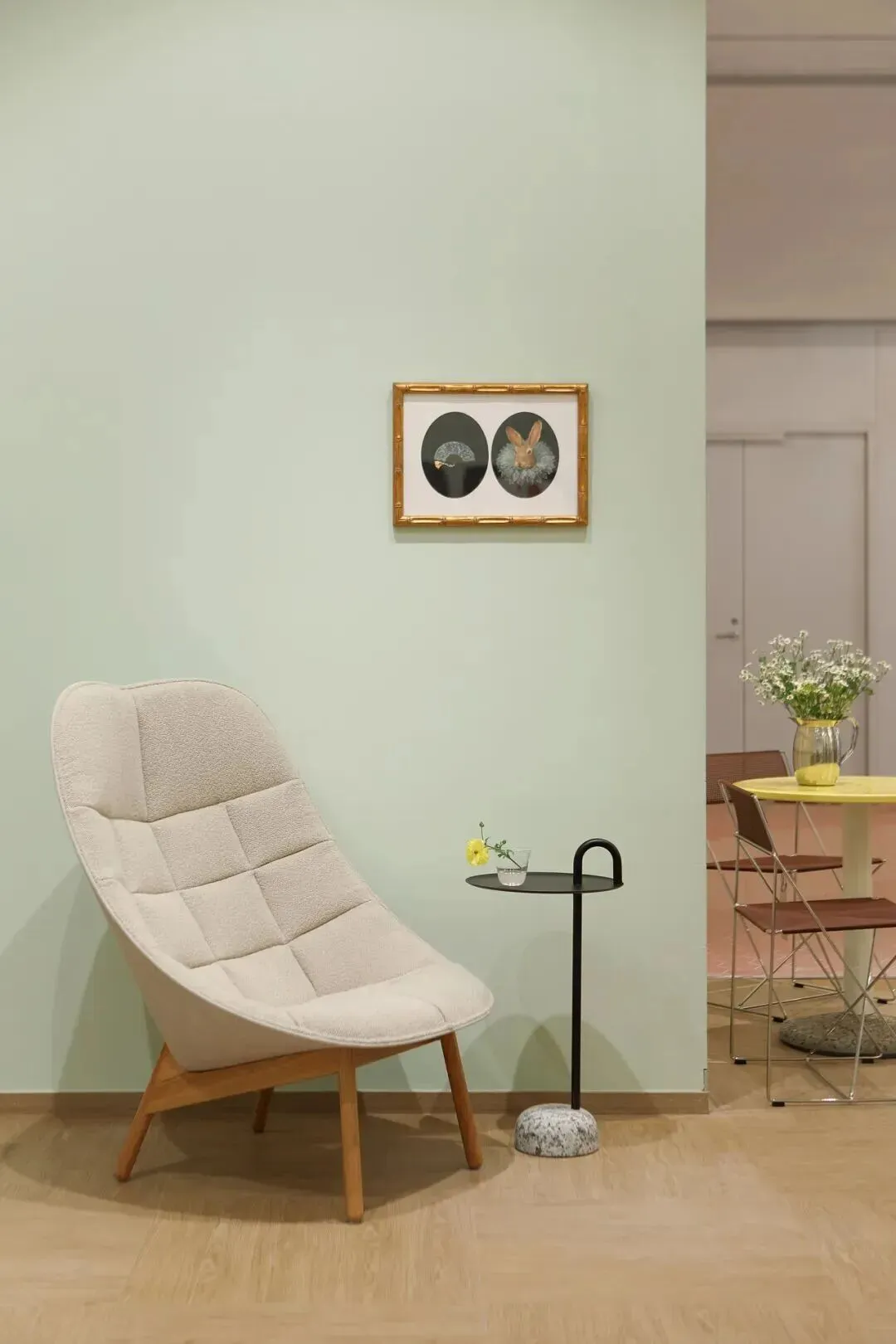 门头以绿色小砖勾勒出有序而清晰的立面结构,形成稳定的视觉节奏,也为城市界面注入一抹轻盈的生活气息。温润的木色地砖与米白基调相互呼应,在时间与使用中建立持久而克制的识别度,让设计以低调而长期的方式存在于空间之中。