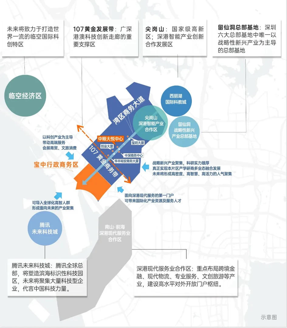 向前对接前海宝中与企鹅岛,向后链接南山西丽创新智核,先进制造业产业全链条;深圳最大科技创新中心+西部最大智造工业区,开辟现代服务业“前海赛道”,培育软件与互联网业“超级黑马”,打造国际消费和贸易增长极。