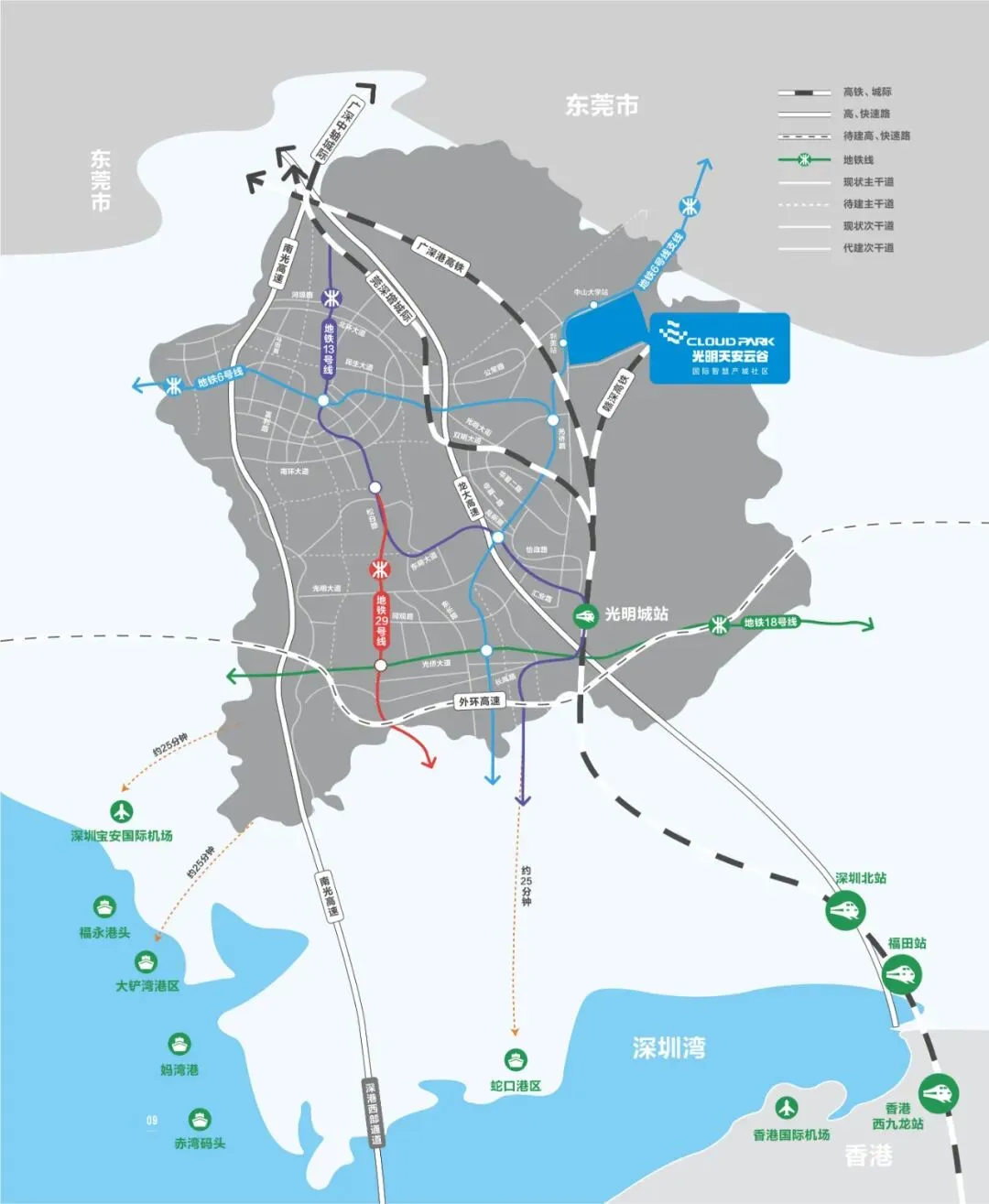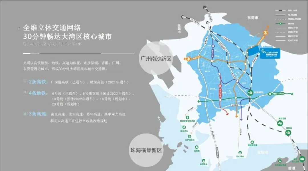 光明区以高铁枢纽、地铁、高速为依托,连接深圳、香港、广州、东莞等周边城市,形成30分钟大湾区核心城市交通圈。