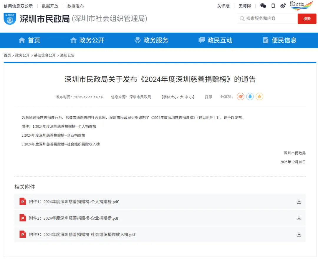▲深圳市民政局关于发布《2024年度深圳慈善捐赠榜》的通告