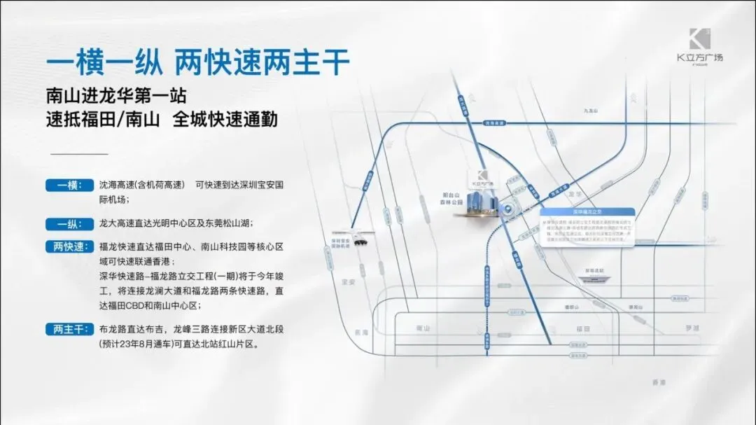 一横:沈海高速可快速到达深圳宝安国际机场一纵:龙大高速直达光明中心区及东莞松山湖