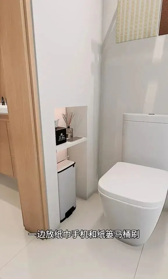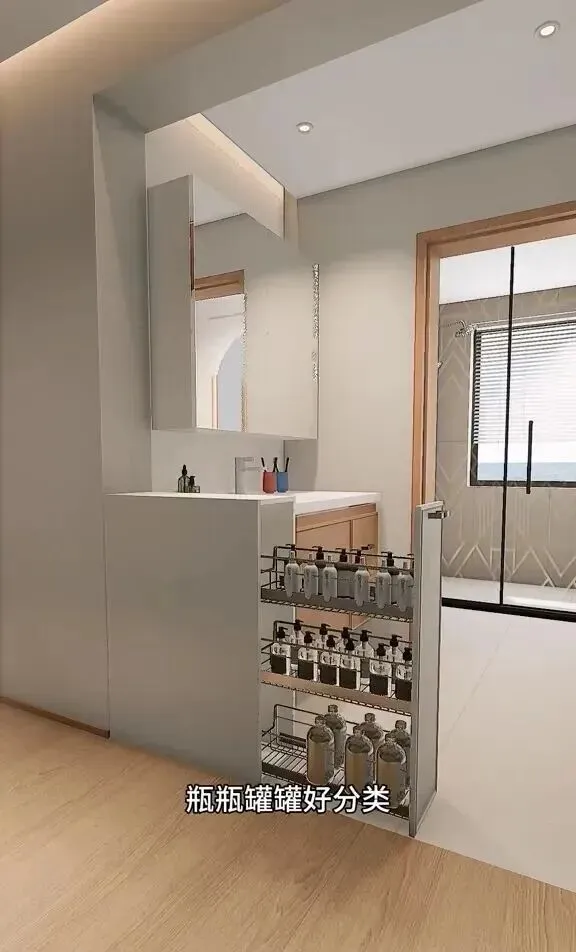 3 再说马桶旁边,她家装了个蓬松的大收纳柜,我特意打开看了看,闷头能塞三大包厕纸,日用品全藏得严严实实,但里面取用还特别方便,柜门是那种无拉手磁吸的,外表看上去一体,干净利落,这种收纳比外面那些挂篮收纳好多了,再也不用担心来人看到厕所里乱七八糟的东西,整个卫生间立马显高档不少,我第一次见还以为就是柜墙,结果一按还能弹开,真是服气。