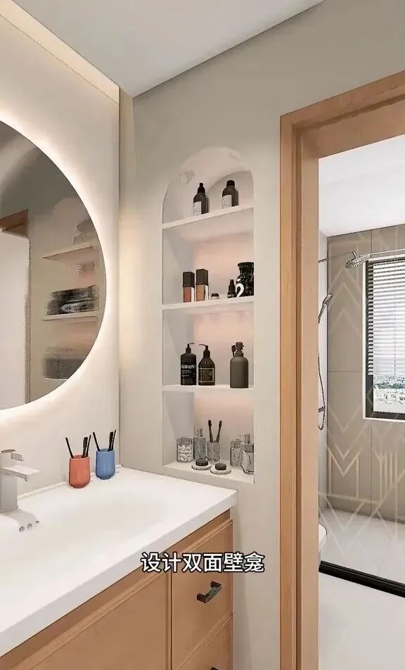 4 照明也很有讲究,顶上没装传统的灯,而是选的氛围线灯,镜前灯搭配柔光,开灯一刹那,光线均匀地打下来,我站在镜子前也不会觉得刺眼,人照着特别自然,而且洗手台和淋浴区的灯可以单独开关,晚上起来上厕所用微光模式,完全不会影响家人休息,她说这个设计是网上抄来的,但用起来绝对是实用型,晚上不怕灯太亮影响睡眠,我觉得这点设计真的很贴心。