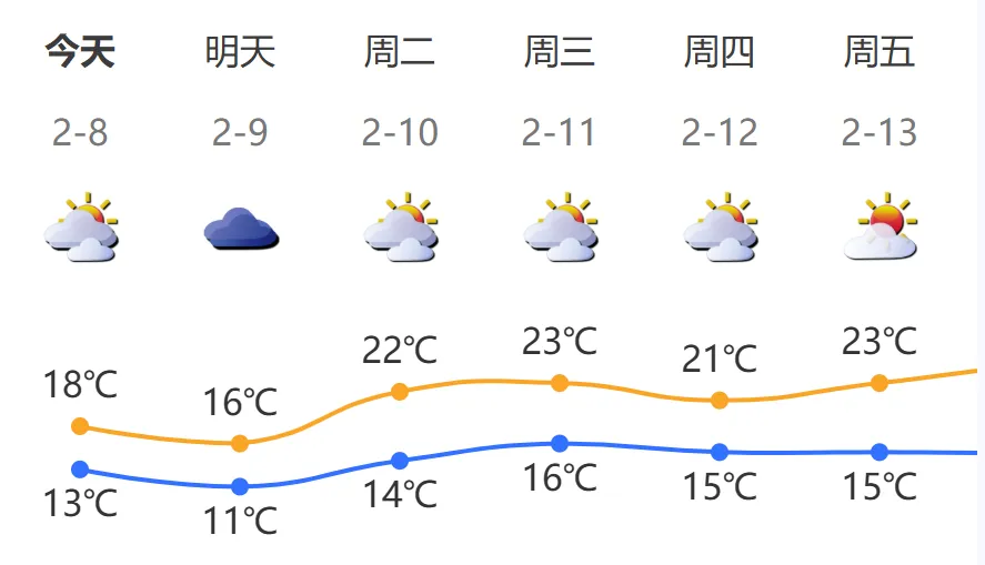 2月8日,多云间晴天,空气干燥;气温13℃—18℃;东北风3—4级,沿海、高地和海区阵风6—7级;相对湿度40%—75%。