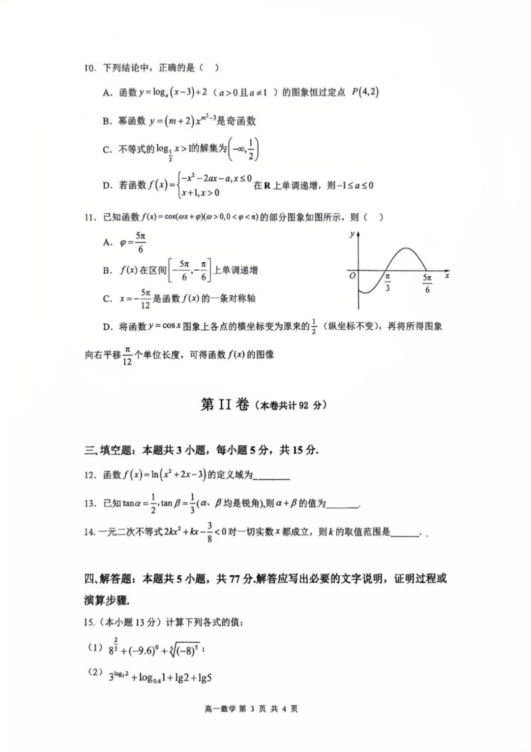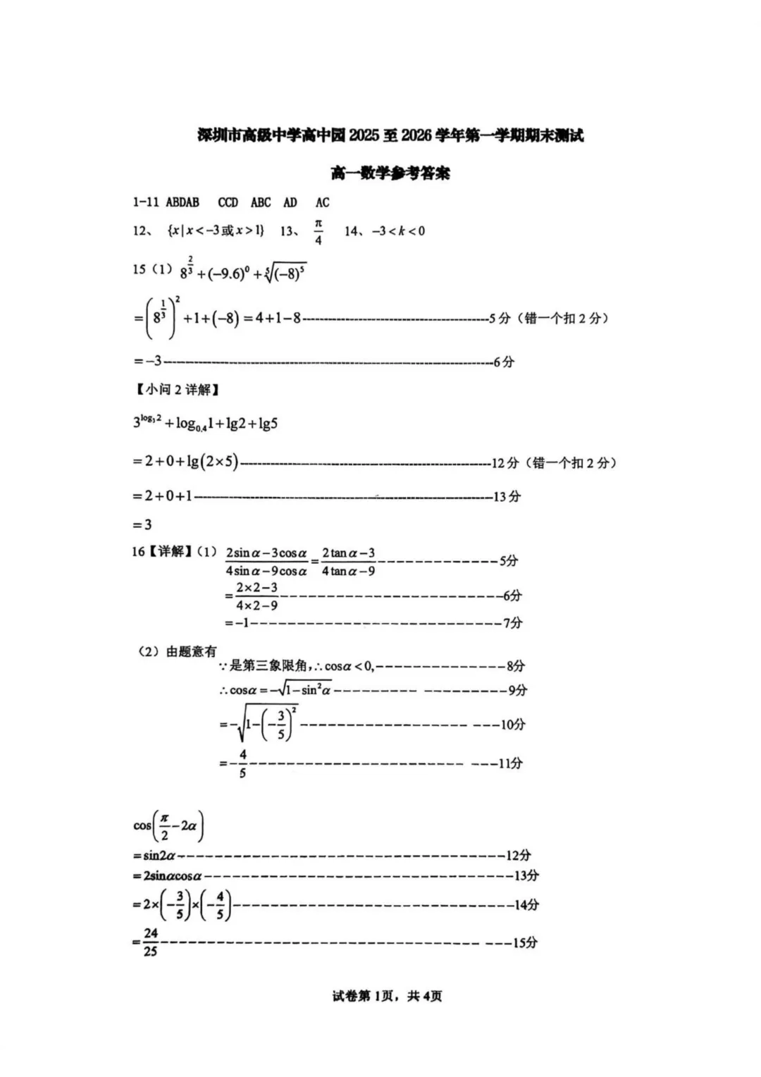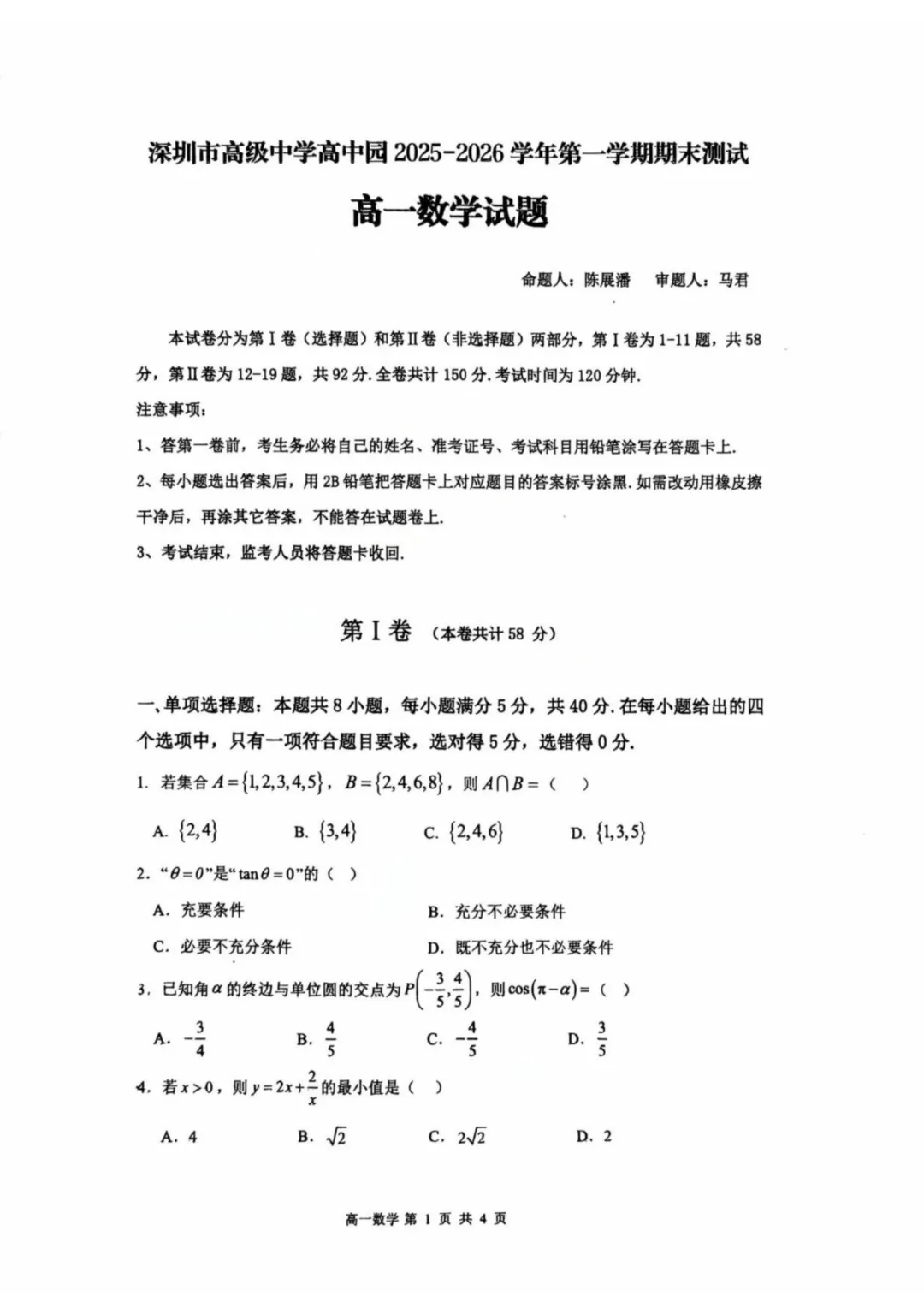 作者寄语:深圳市高级中学高中园2025-2026学年高一上学期期末数学试题+答案,7天有效领取,手慢无!!!