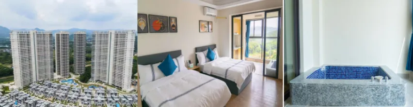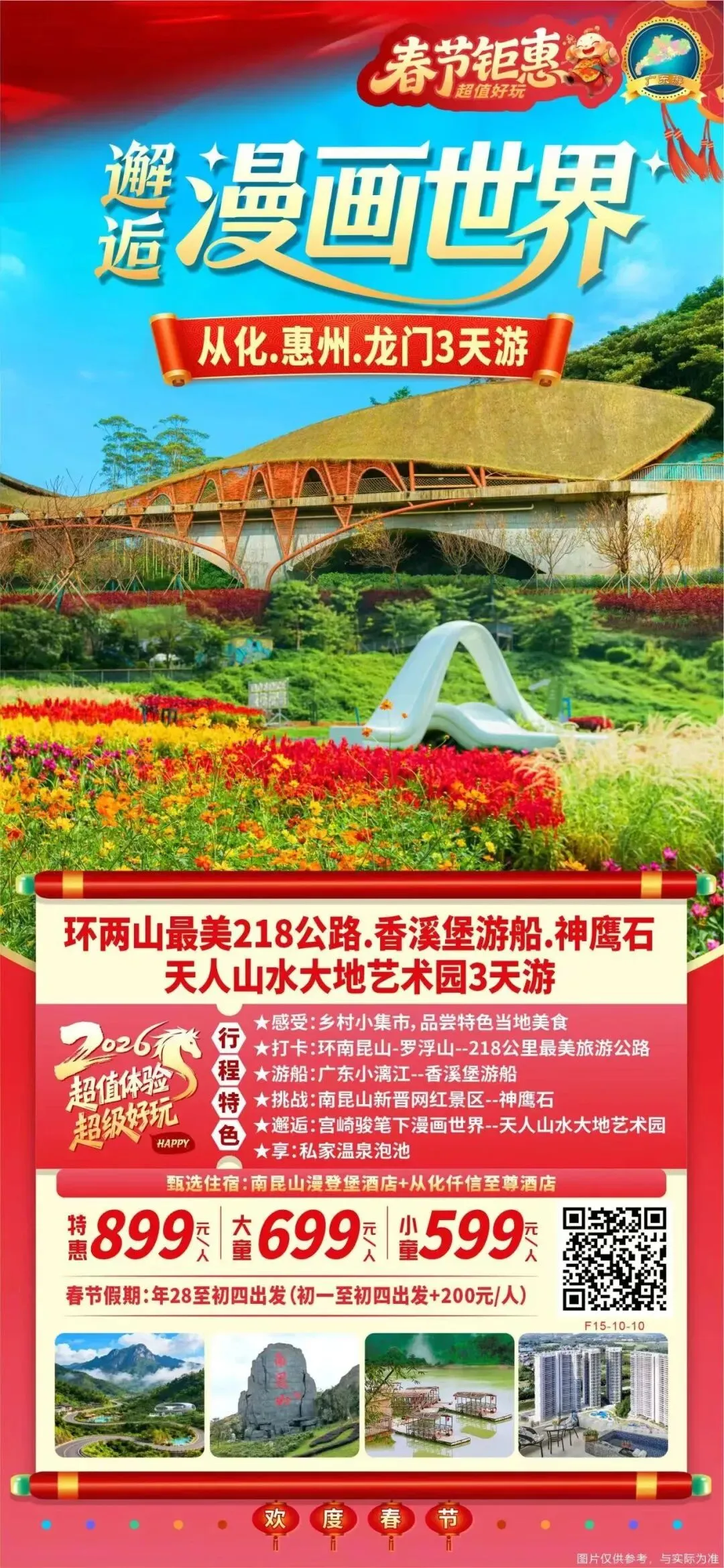 绿屏石滩驿站位于博罗县横河镇通过艺术装置“重景环”营造“花坞樽前微笑”的悠然意趣成为游客打卡拍照、放松歇脚的诗意空间。千年古榕驿站位于麻榨镇中心村禾斜村民小组,在千年古榕的荫庇下,麻榨镇打造了一处融合传统文化意境与现代建筑艺术碰撞的活力空间。这棵古榕树被誉为绿色“活化石”,始栽于北宋景德四年,是国家一级保护古树,也是全市仅存的两棵千年古树之一。12:00午餐自理,自行品尝当地美食(超多小吃和农庄,还有特产市场~ 竹筒饭、正果云吞、山坑螺、胡须烧鸡~等你来解锁)16:00前往入住【漫登堡酒店】位于惠州市龙门县西南部,南昆山野外负离子含量为3.5万个/立方厘米,比鼎湖山的还要高出2倍多,故有“南粤大氧吧”之称。温泉酒店2021年全新营业,星级标准,内设有餐厅、儿童乐吧、室外泳池等,可谓温泉养生、休闲度假、出游胜地。入住后自由活动,浸泡房间私家温泉泡池。住宿:龙门漫登堡酒店