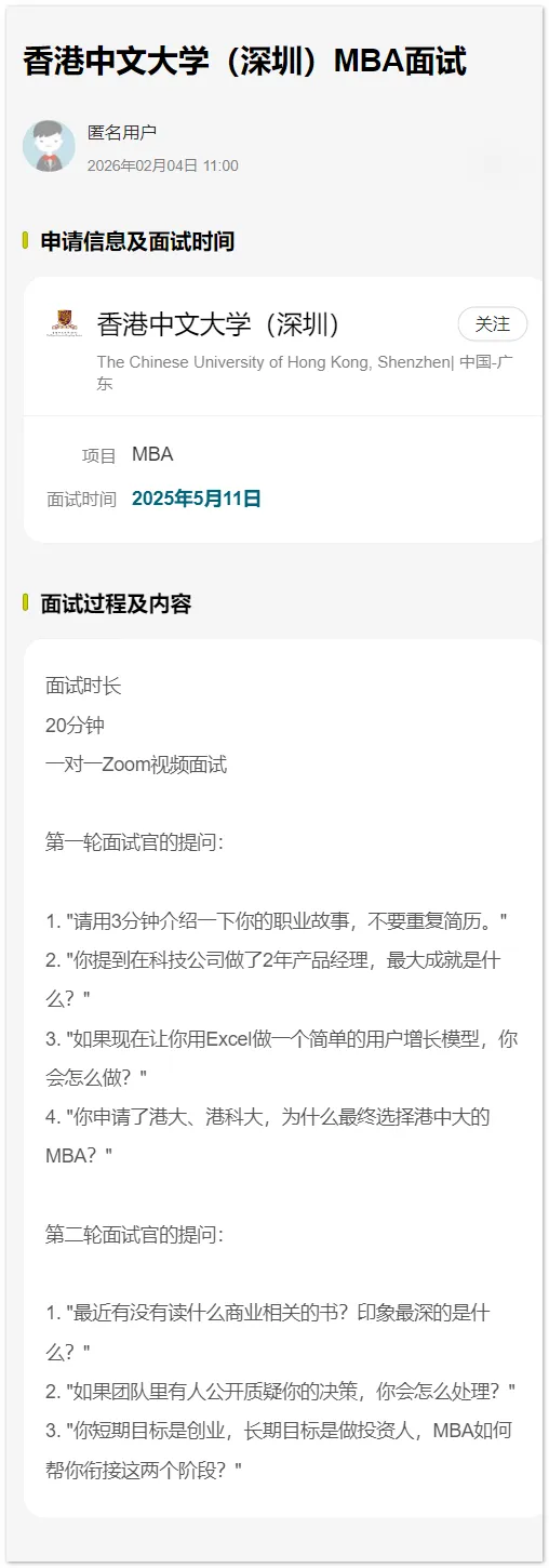 >面经 | 香港中文大学(深圳)MBA