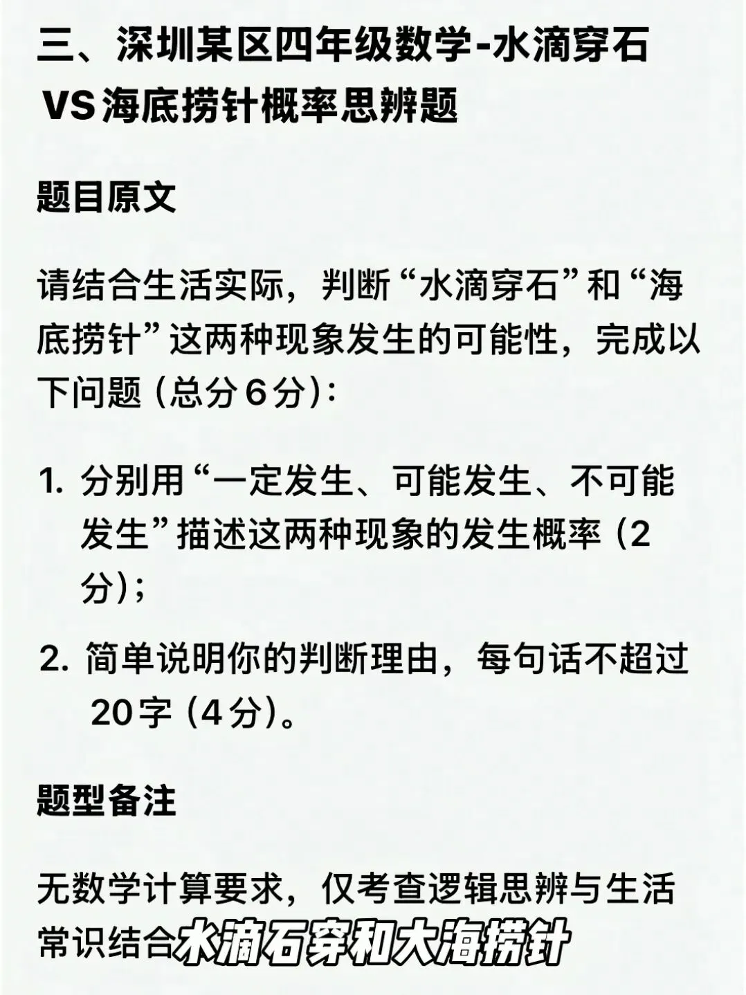 去年此时,深圳小学四年级期末数学卷就因“分不清考数学还是语文”引发热议;今年更狠,语文、数学全面突破“边界”,直接颠覆传统考试认知。四年级数学卷居然考查“水滴石穿”和“大海捞针”两种现象的发生可能性,还要求简述判断理由——这道题一出,家长彻底懵了:这到底是考逻辑思辨,还是考语文理解?